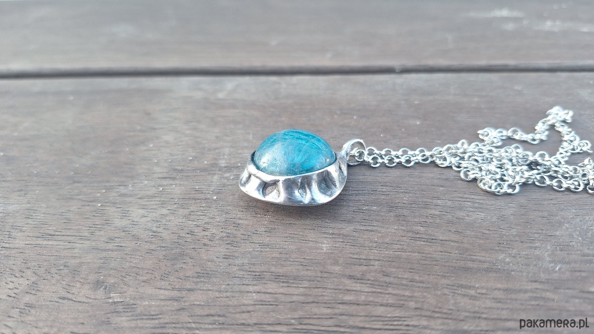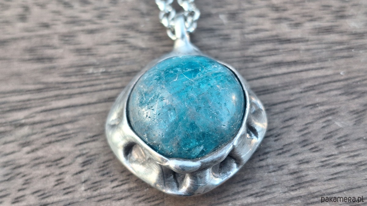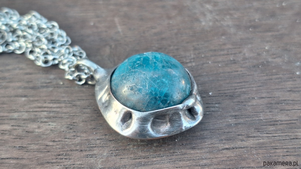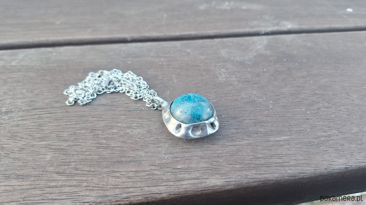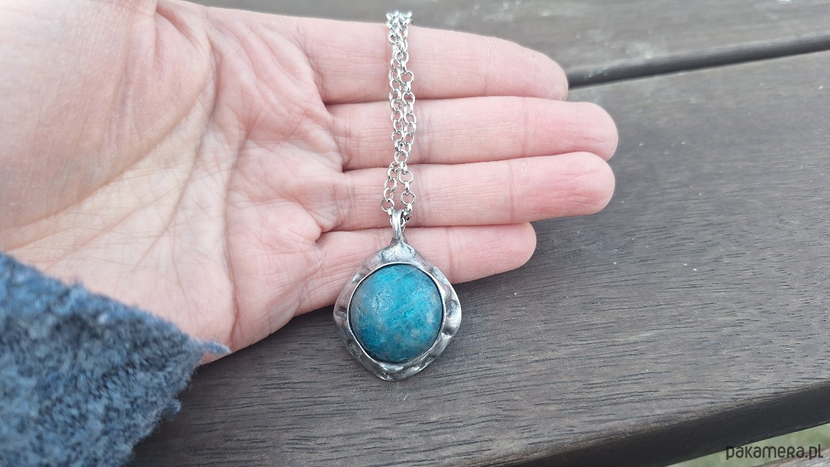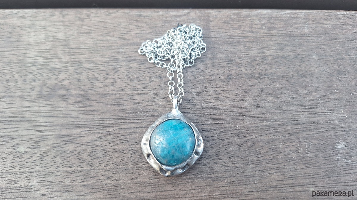 Wisiorek wykonany z miedzi, cyny i apatytu. Wymiary ok. 3 na 3 cm. Zawieszony na łańcuszku o długości ok. 50 cm.