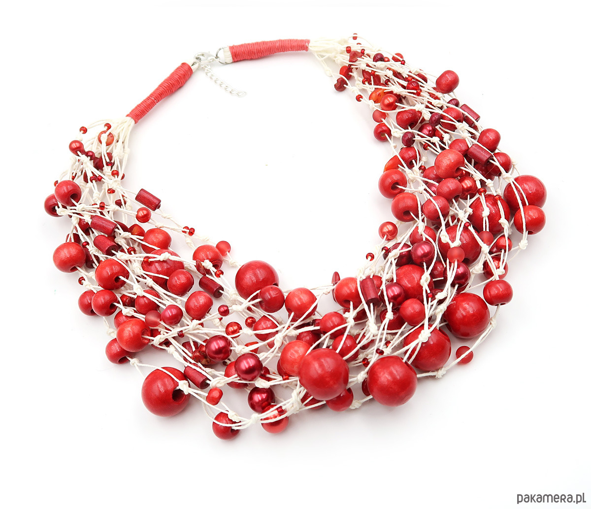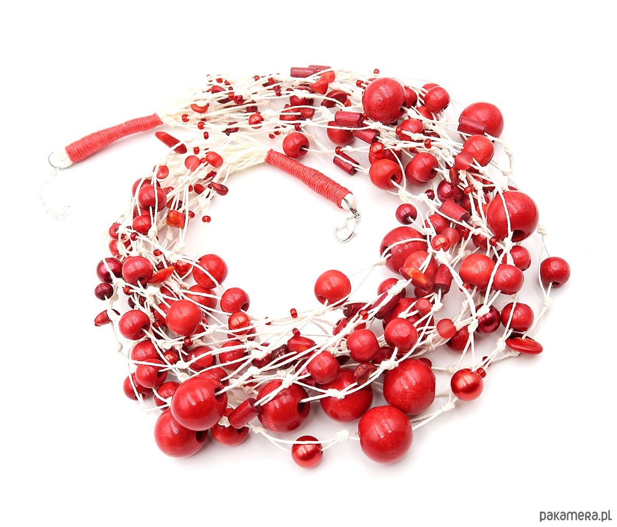 Wyrazisty, nasycony czerwienią naszyjnik wykonany na bazie bielonej przędzy lnianej z malinowym wykończeniem. W splocie zatopione są drewniane elementy, bryłki koralowca, szklane perły oraz szkło Jablonex. Całość utrzymana w tonacji czerwonego wina z akcentem soczystego karminu.