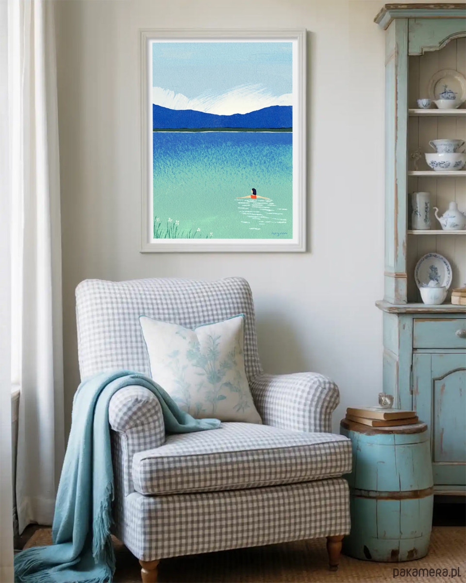 Plakat „Poranek nad jeziorem” przedstawia ten cudowny moment lata, gdy po raz pierwszy tego dnia zanurzamy się w wodzie. Na plakacie dziewczyna w czerwonym kostiumie powoli idzie w wodzie w stronę horyzontu, pozostawiając na powierzchni trop z białych fal.