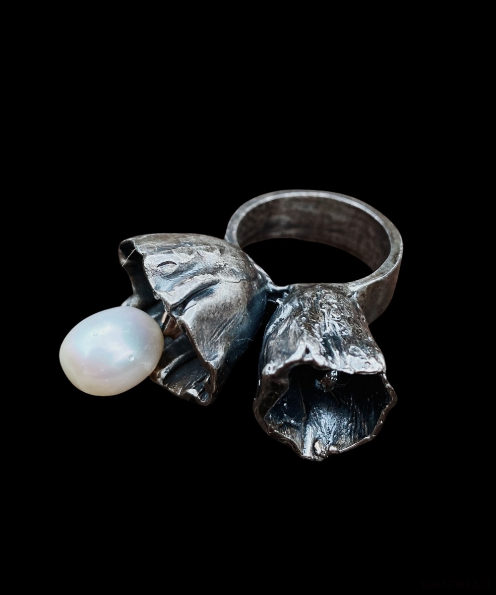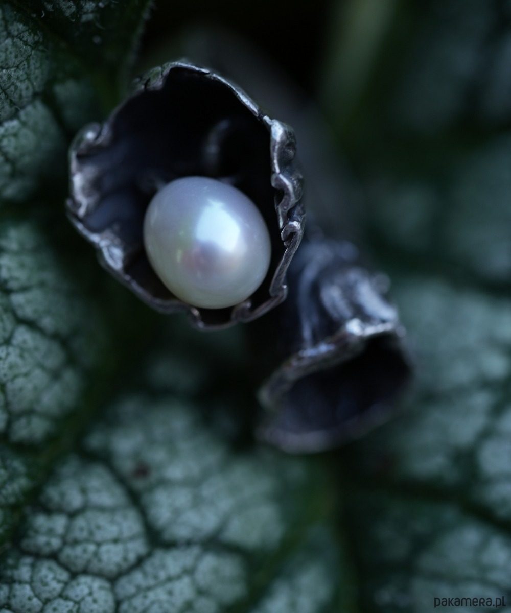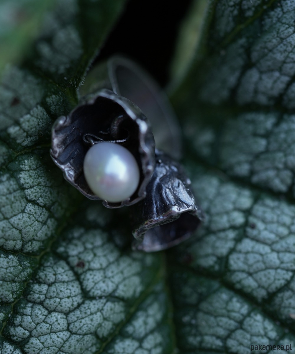 Wykonany z najwyższej jakości srebra, ozdobiony jest dwoma misternie wyrzeźbionymi kielichami kwiatów, z których jeden skrywa ruchomą perłę.