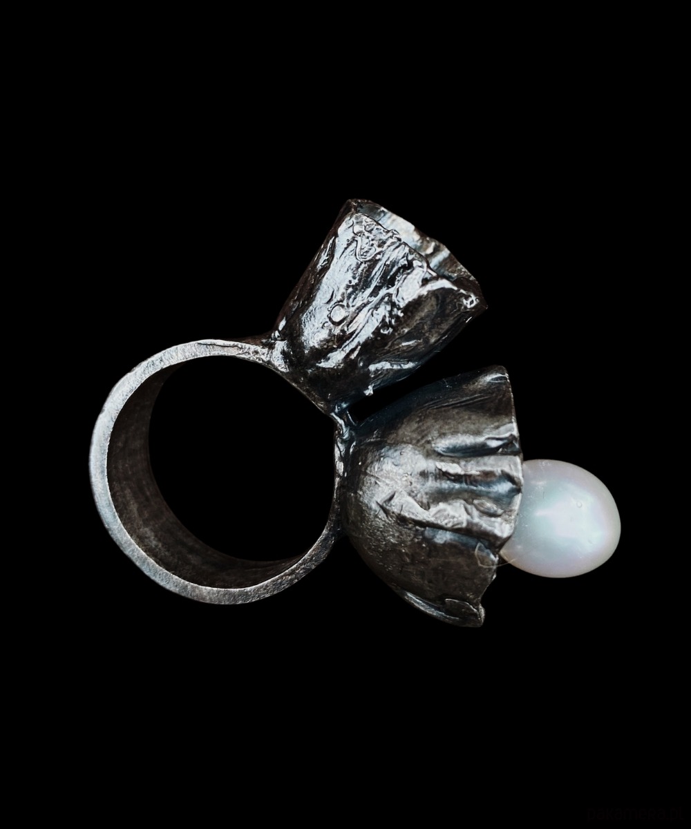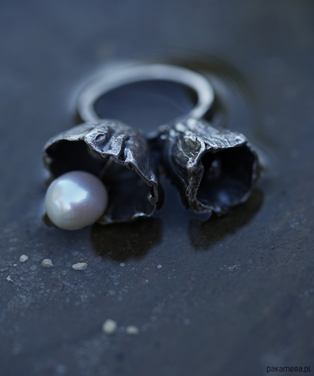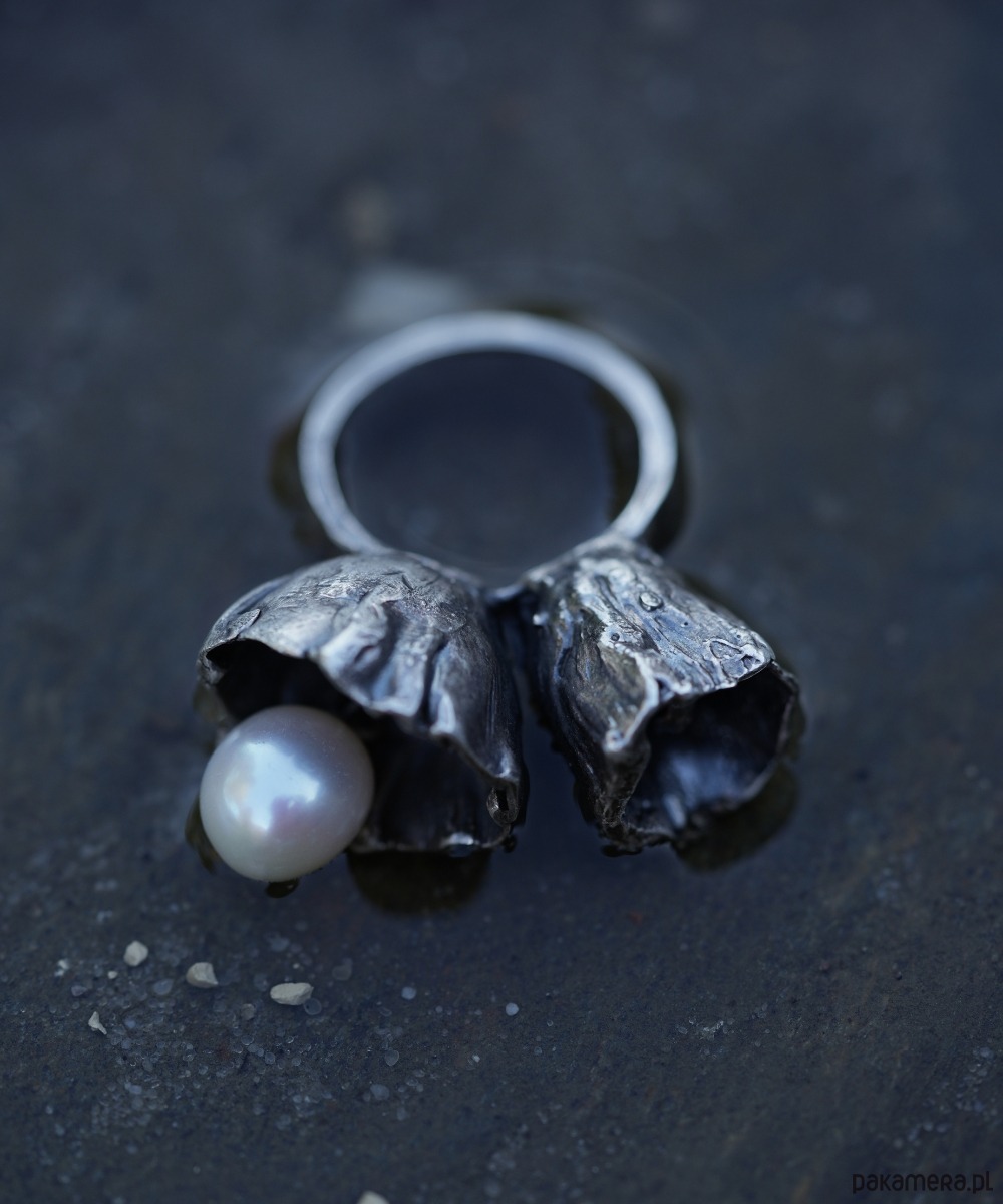 Pierścień wykonany ze srebra najwyższej próby Art Clay Silver 999 z hodowlaną perłą.