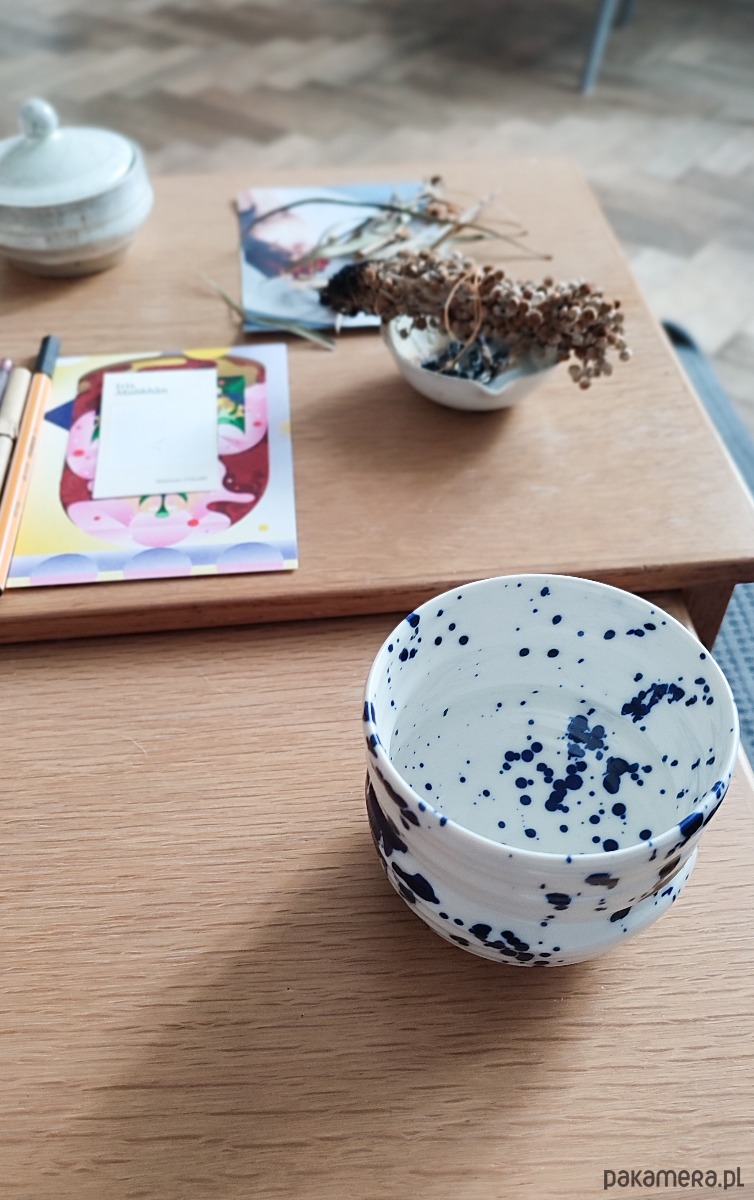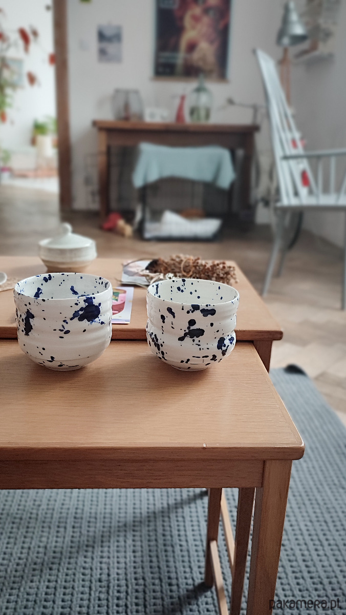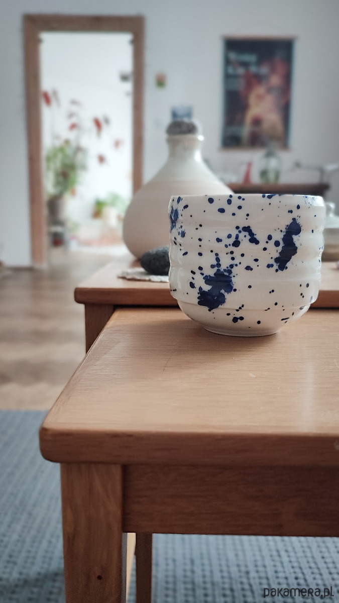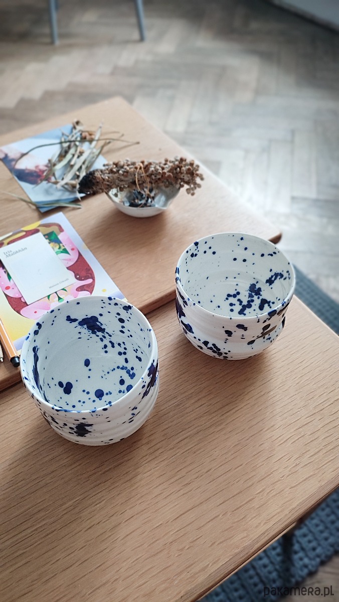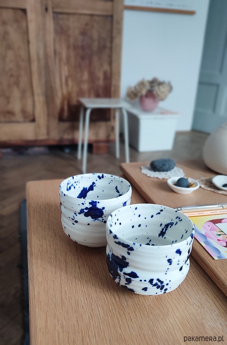 Ręcznie wykonana ceramiczna czarka z białej porcelany z kobaltowymi chlapnięciami.