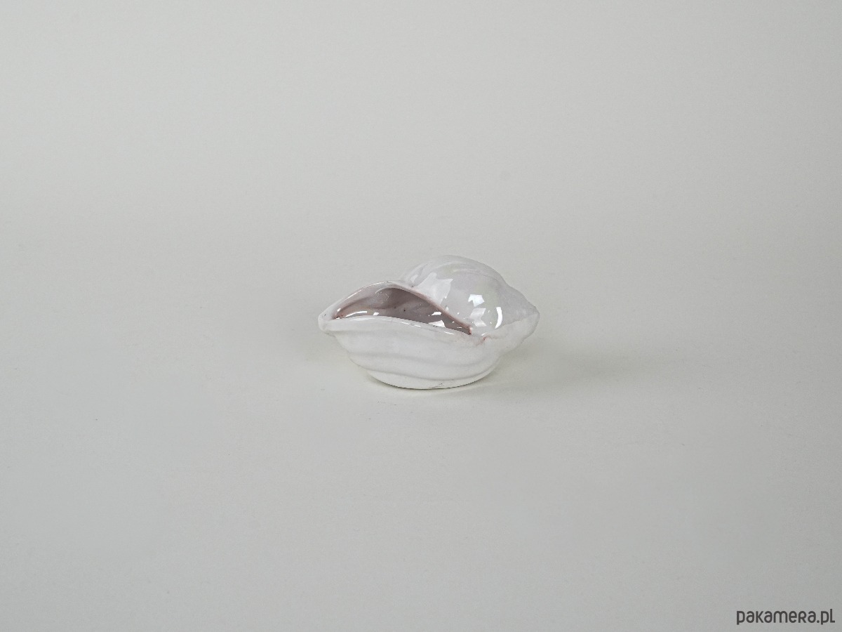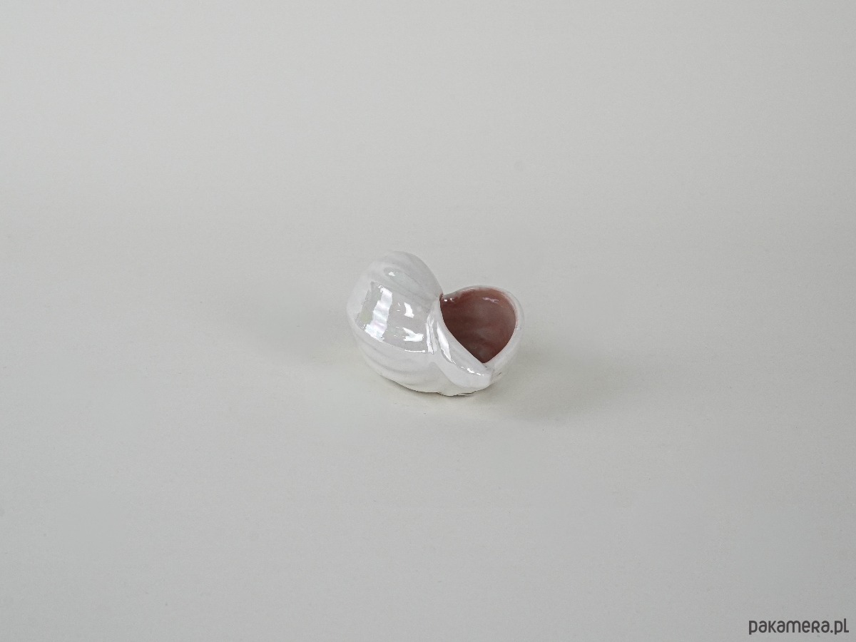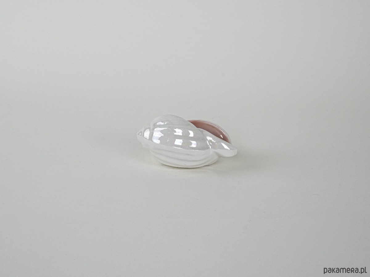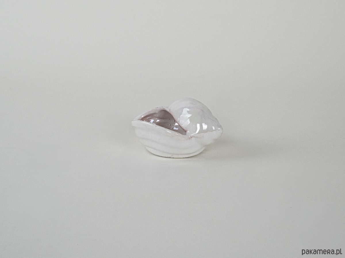 Dekoracyjna porcelanowa muszla w odcieniach perłowego różu z delikatnym opalizującym połyskiem. Wykonana prawdopodobnie w latach 70.–80. XX wieku, może pełnić funkcję niewielkiego pojemnika lub ozdoby w stylu nadmorskim. Subtelne wykończenie i pastelowa kolorystyka nadają jej lekkości i elegancji, czyniąc ją ciekawym akcentem kolekcjonerskim.
