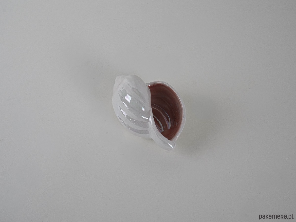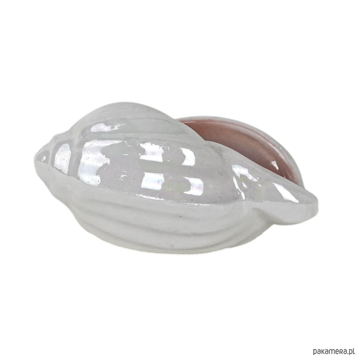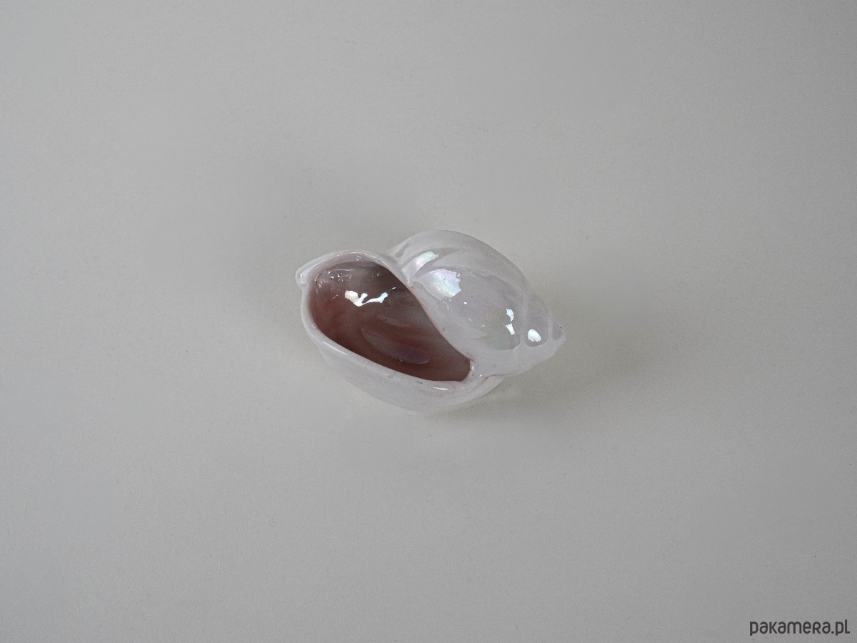 Dekoracyjna porcelanowa muszla w odcieniach perłowego różu z delikatnym opalizującym połyskiem. Wykonana prawdopodobnie w latach 70.–80. XX wieku, może pełnić funkcję niewielkiego pojemnika lub ozdoby w stylu nadmorskim. Subtelne wykończenie i pastelowa kolorystyka nadają jej lekkości i elegancji, czyniąc ją ciekawym akcentem kolekcjonerskim.