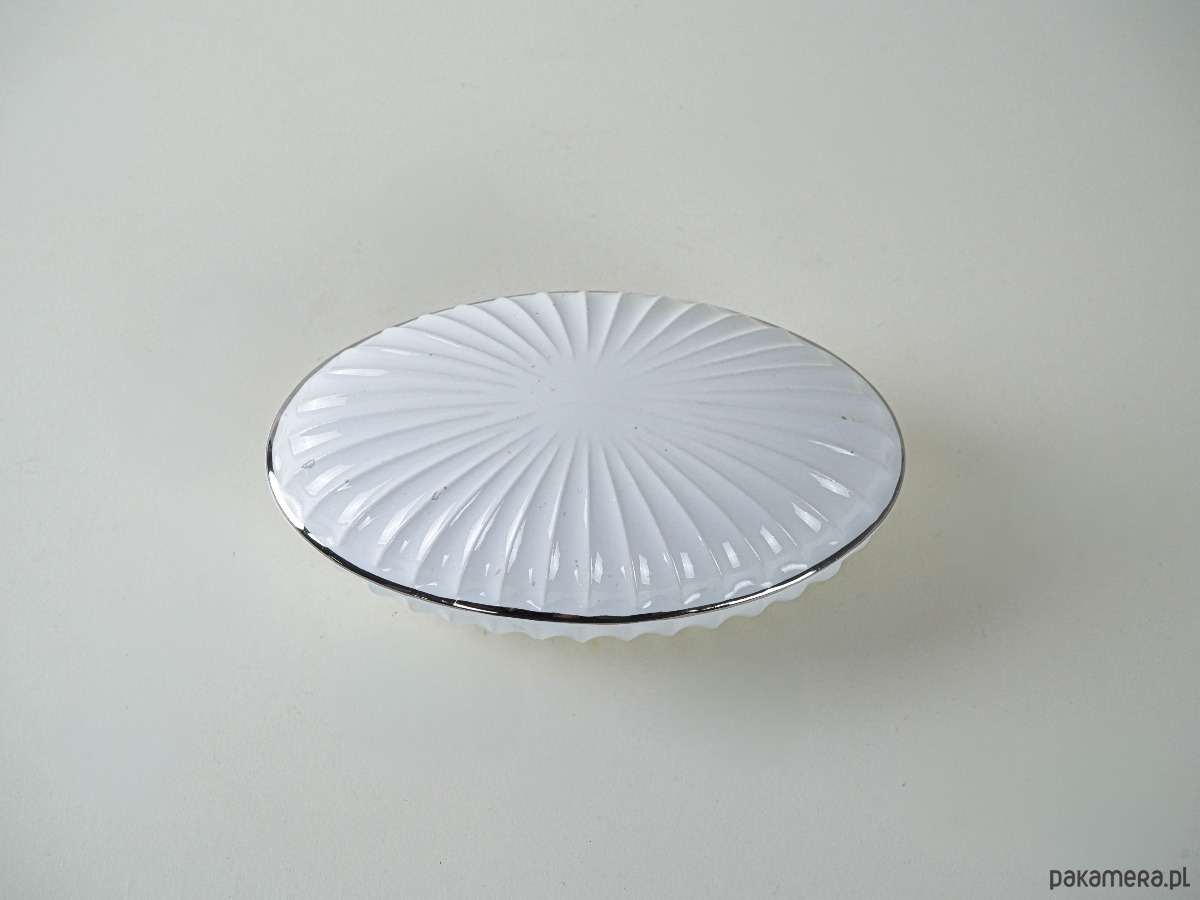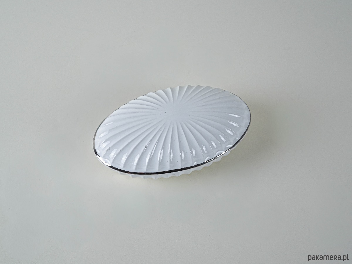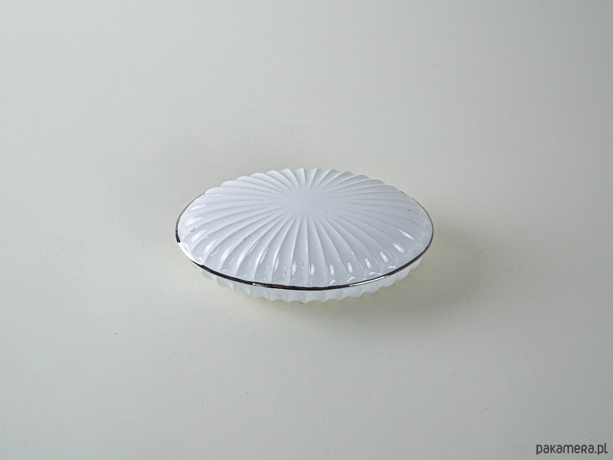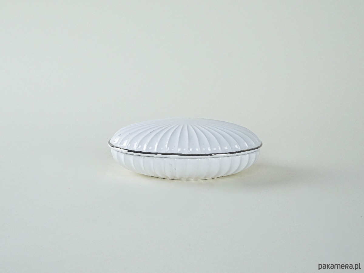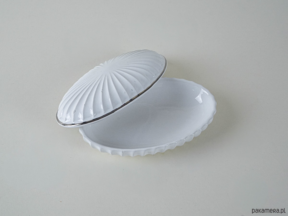 Elegancka, porcelanowa szkatułka o opływowym kształcie inspirowanym muszlą, z delikatnym rowkowaniem i srebrną linią na obwodzie. Idealna do przechowywania biżuterii, pamiątek lub drobnych kosmetyków. Utrzymana w klasycznej bieli.