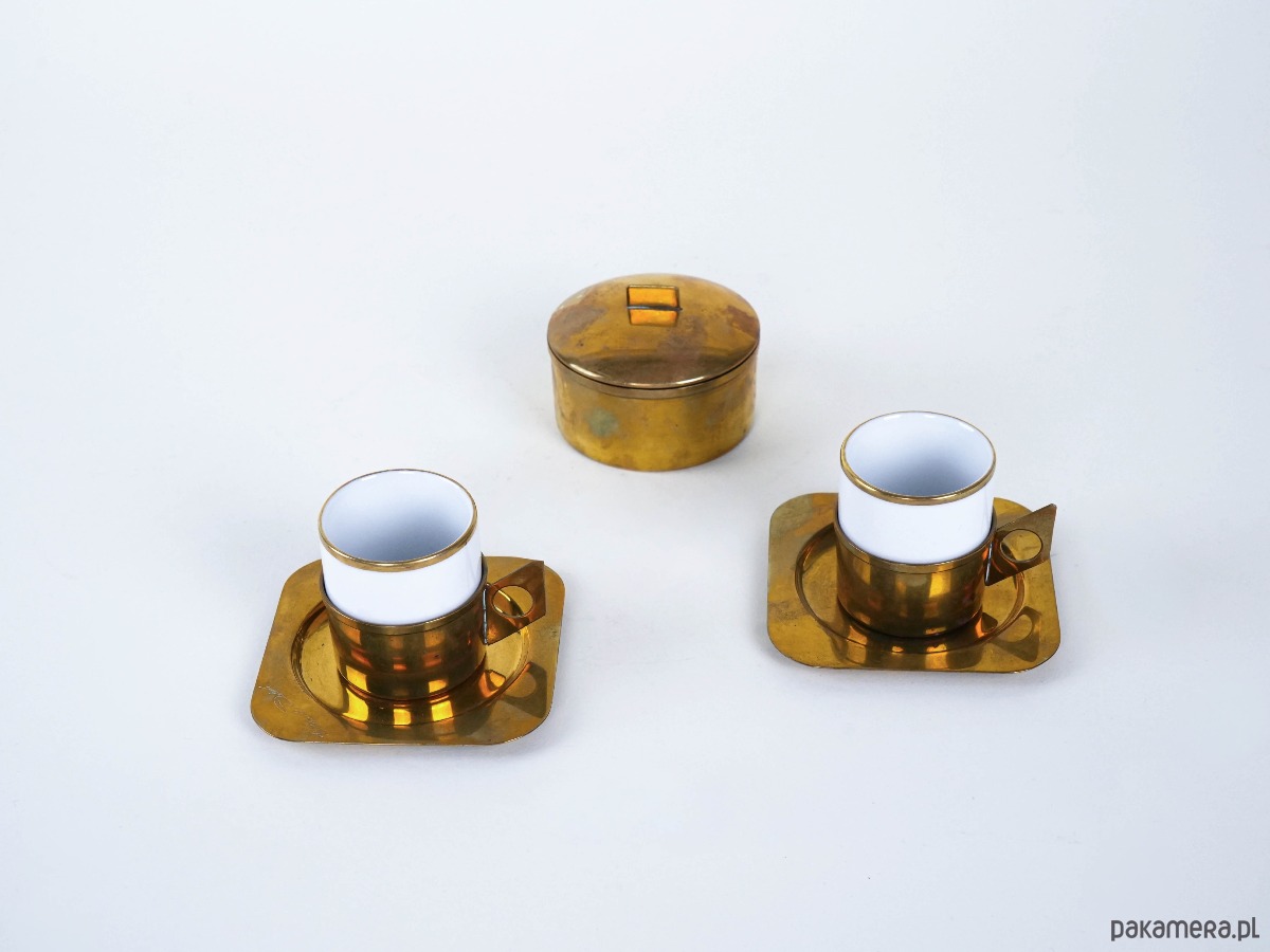 Zestaw dwóch filiżanek z białej porcelany osadzonych w geometrycznych, złoconych oprawkach z mosiądzu oraz cukiernicy z pokrywką. Sygnatura Claude Delvé per Delfi potwierdza autentyczny projekt modernistyczny z lat 70., doceniany przez kolekcjonerów designu mid-century. Oryginalny egzemplarz vintage o wysokich walorach estetycznych i kolekcjonerskich.