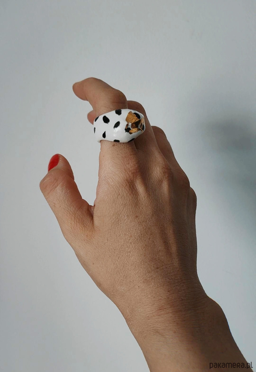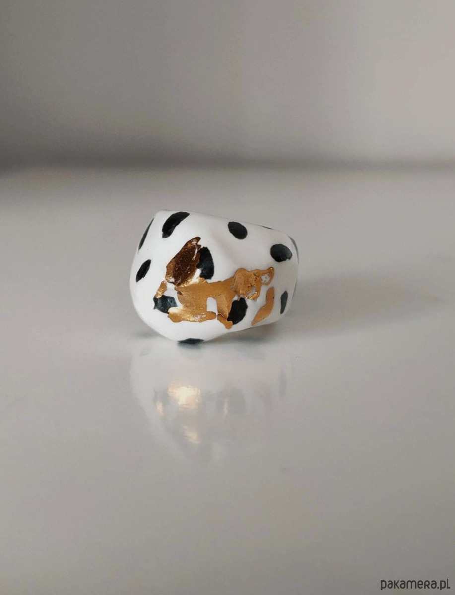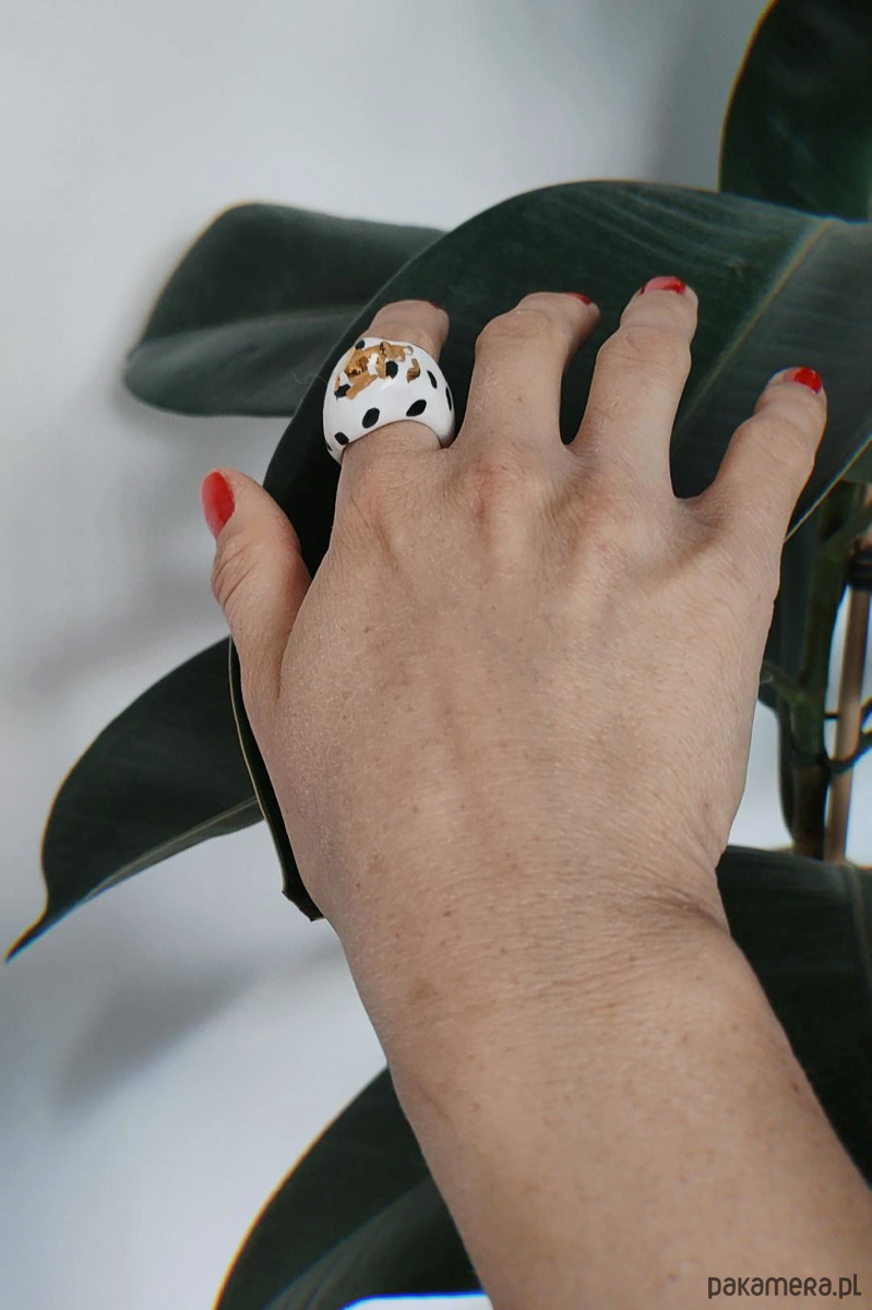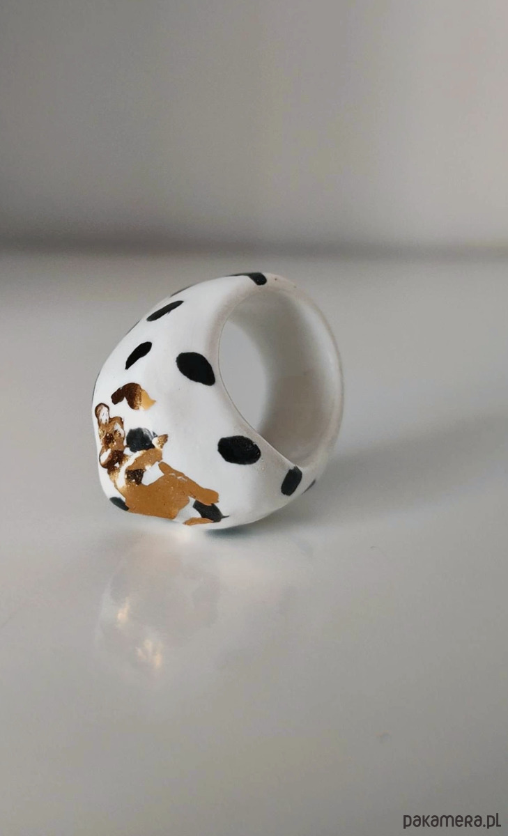 Unikatowy pierścionek z porcelany, zdobiony prawdziwym złotem.