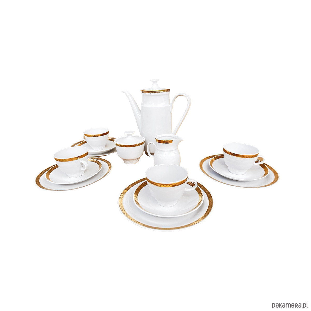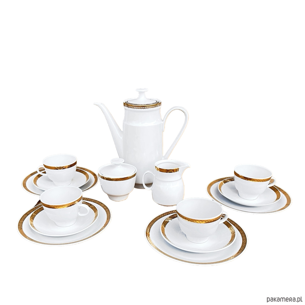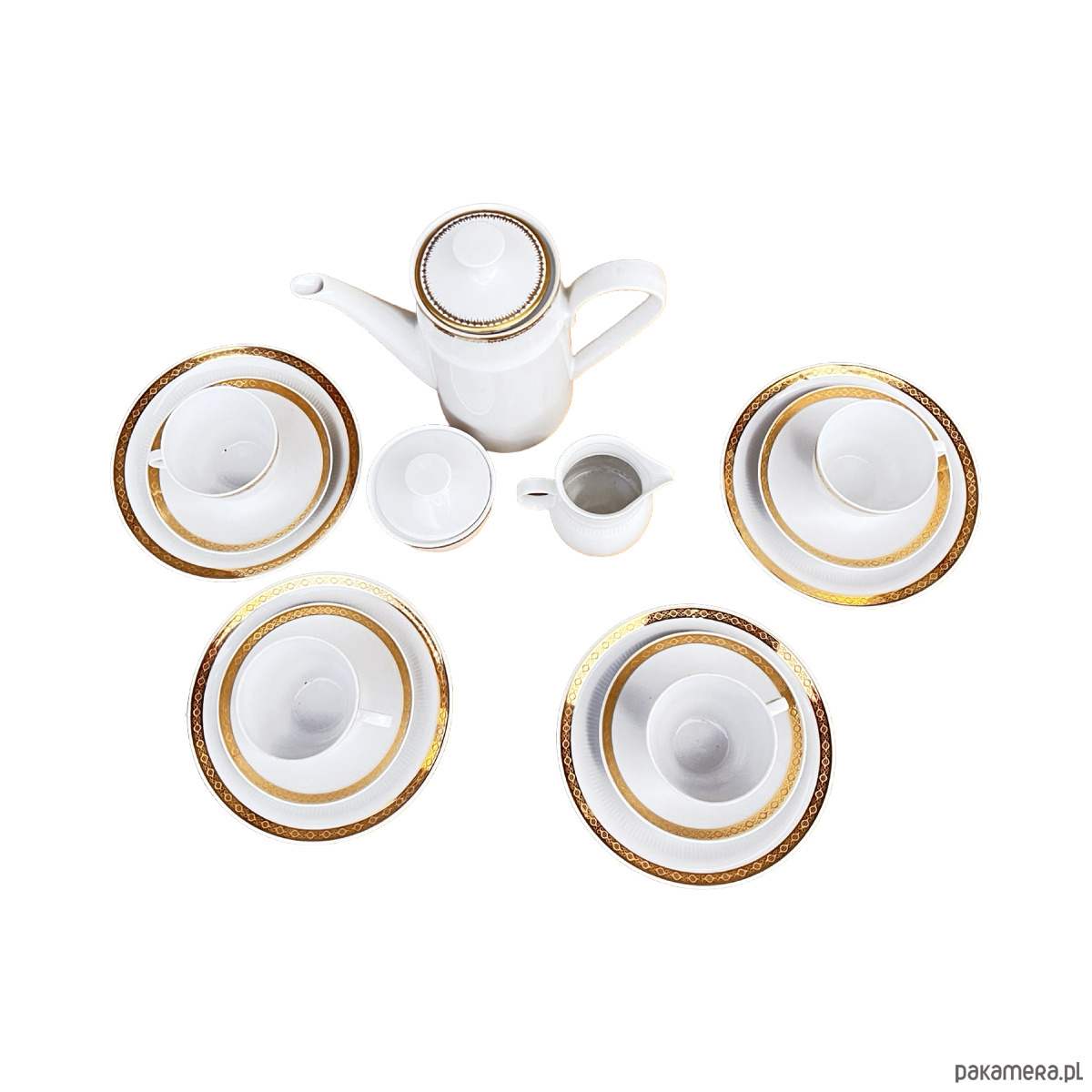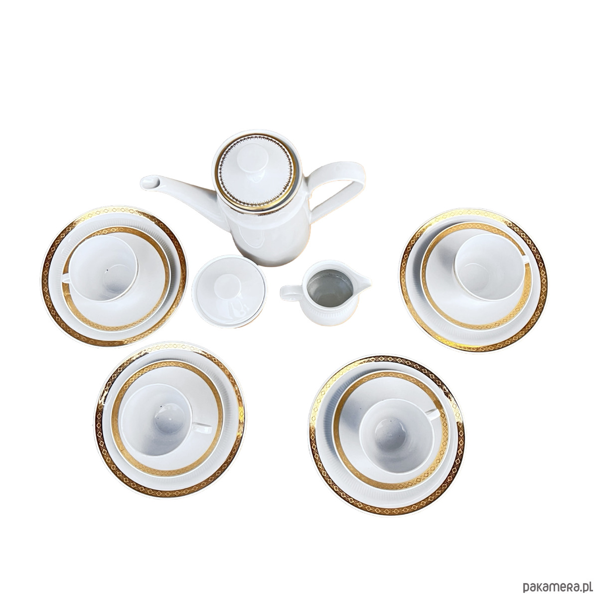 Porcelanowy serwis kawowy w stylu klasycystycznym dla 4 osób. W jego skład wchodzi: 4x filiżanka, 4x spodek, 4x talerzyk deserowy, mlecznik, cukiernica oraz dzbanek. Pochodzi z niemieckiej wytwórni porcelany Colditz. Lata 70. XXw.