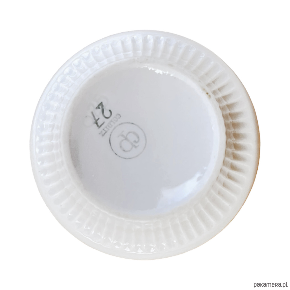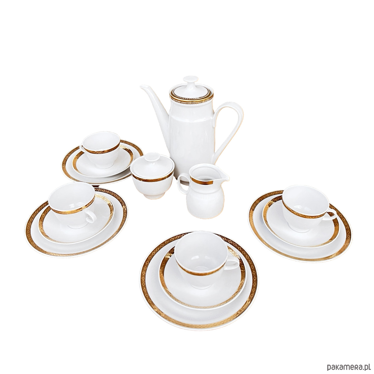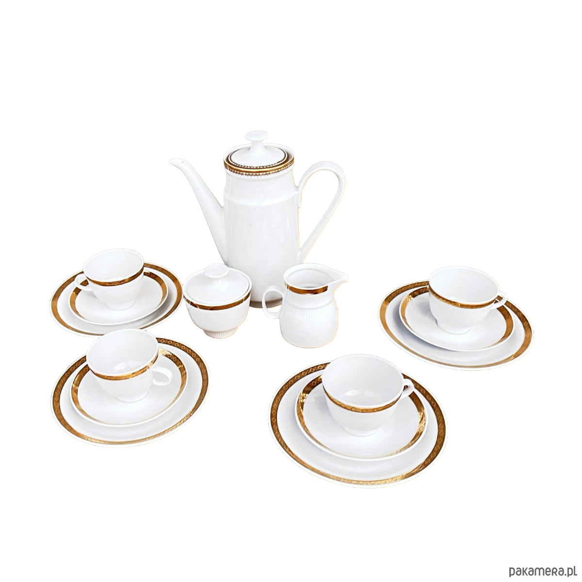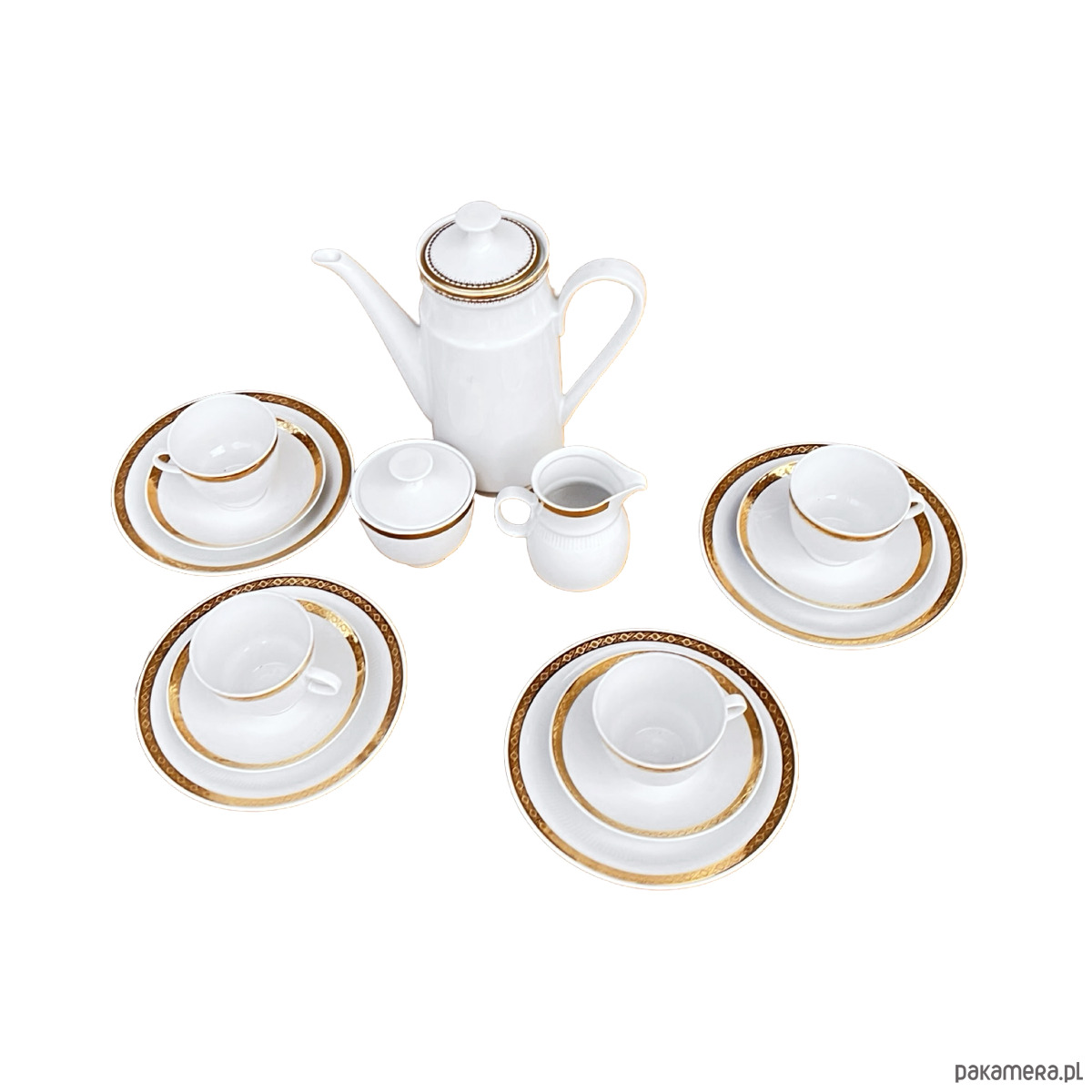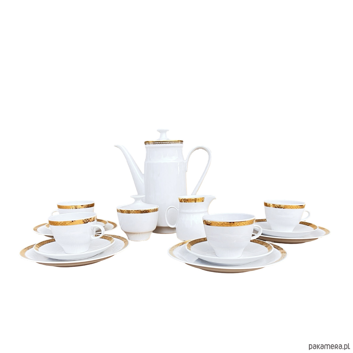 Porcelanowy serwis kawowy w stylu klasycystycznym dla 4 osób. W jego skład wchodzi: 4x filiżanka, 4x spodek, 4x talerzyk deserowy, mlecznik, cukiernica oraz dzbanek. Pochodzi z niemieckiej wytwórni porcelany Colditz. Lata 70. XXw.