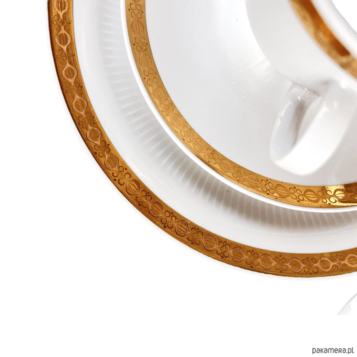 Złocenia bez przetarć. Brak rys użytkowych na taflach talerzyków. Złocony pasek wewnątrz filiżanki ma kilka nierówności pokazanych na zdjęciach. Przedmiot stgnowany.