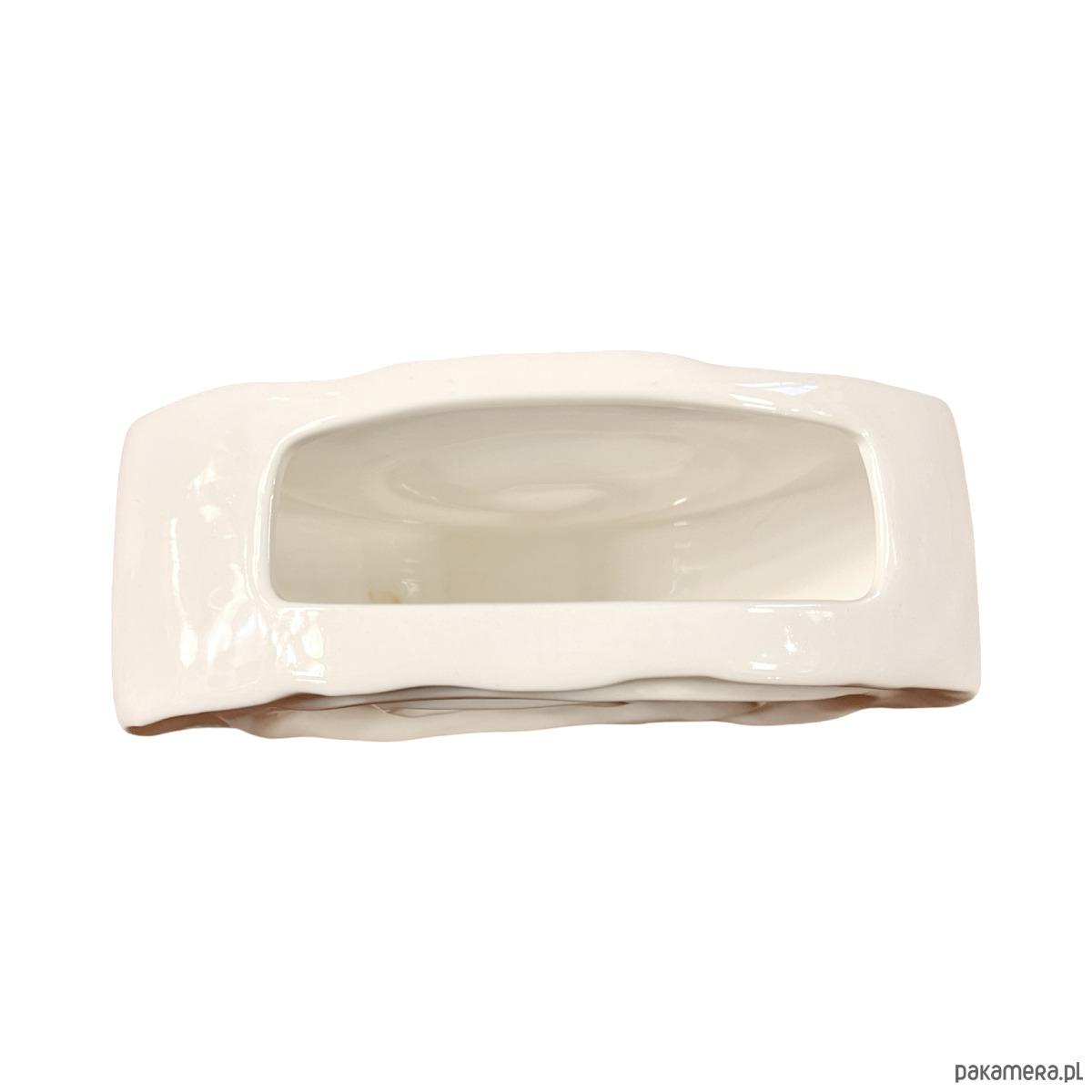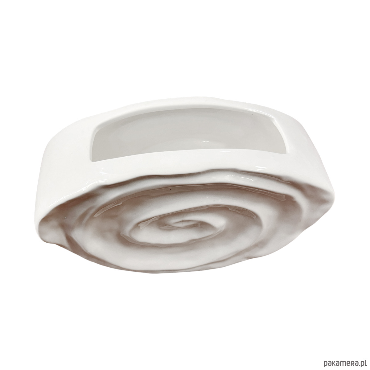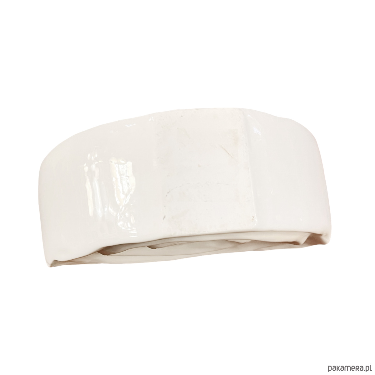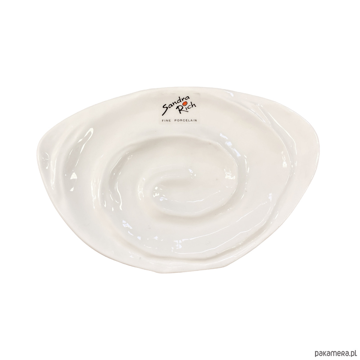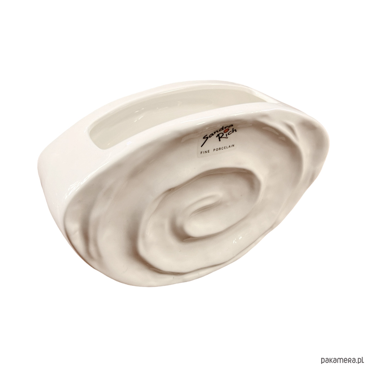 Wazon o niekonwencjonalnym designie w stylu future. Powierzchnia wazonu jest biała, szkliwiona o ciekawej fromie. Wazon został wykonany ręcznie w bardzo ciekawym, niepowtarzalnym kształcie i stylu. Przedmiot wyprodukowany pod koniec XX wieku przez firmę Sandra Rich z Niemiec. Wazon zachowany w stanie bardzo dobrym, bez uszkodzeń. Zachowana naklejka firmowa.