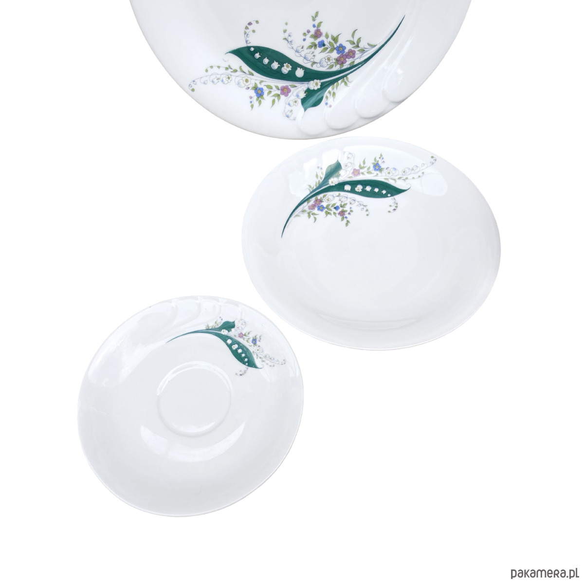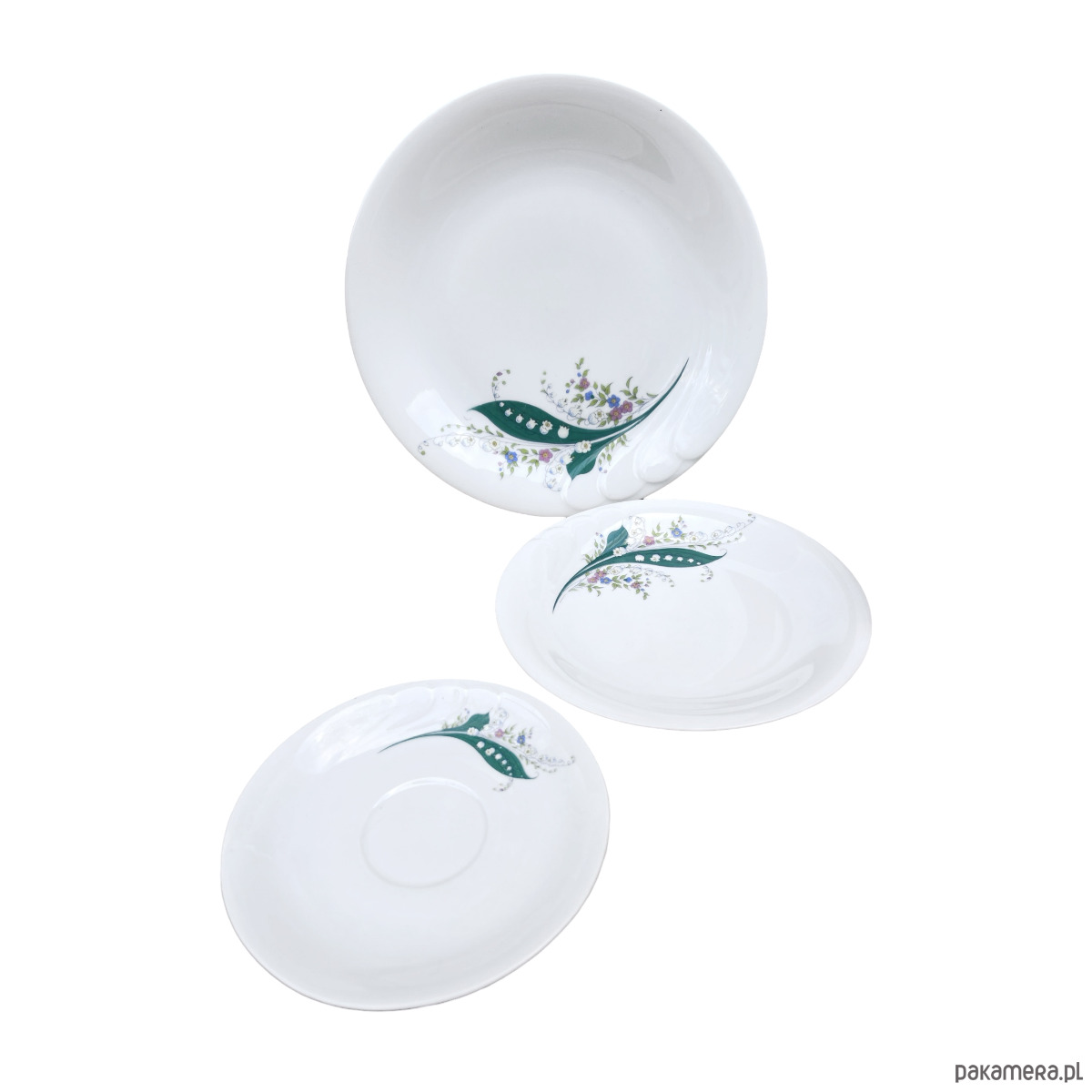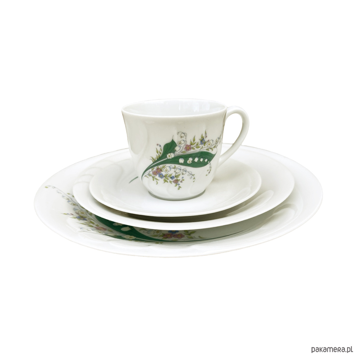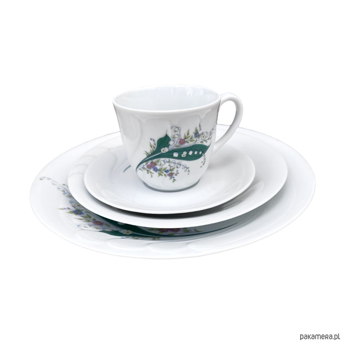Ciekawy zestaw śniadaniowy wyprodukowany przez Zakłady Porcelany Stołowej "Wawel" / "Krzysztof" w Wałbrzychu w drugiej połowie XX wieku. Zestaw składa się z filiżanki, spodka, małego talerzyka i dużego talerza. zestaw zdobiony kalkomanią we wzór konwalii. Powiększony zestaw śniadaniowy czteroczęściowy, przedmiot sygnowany.