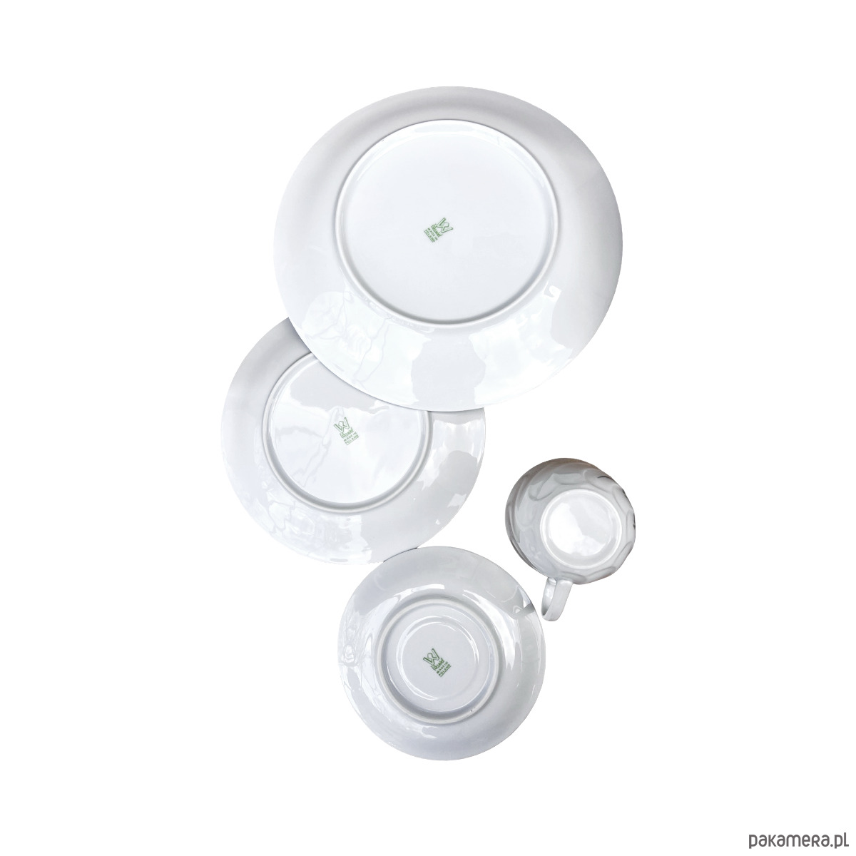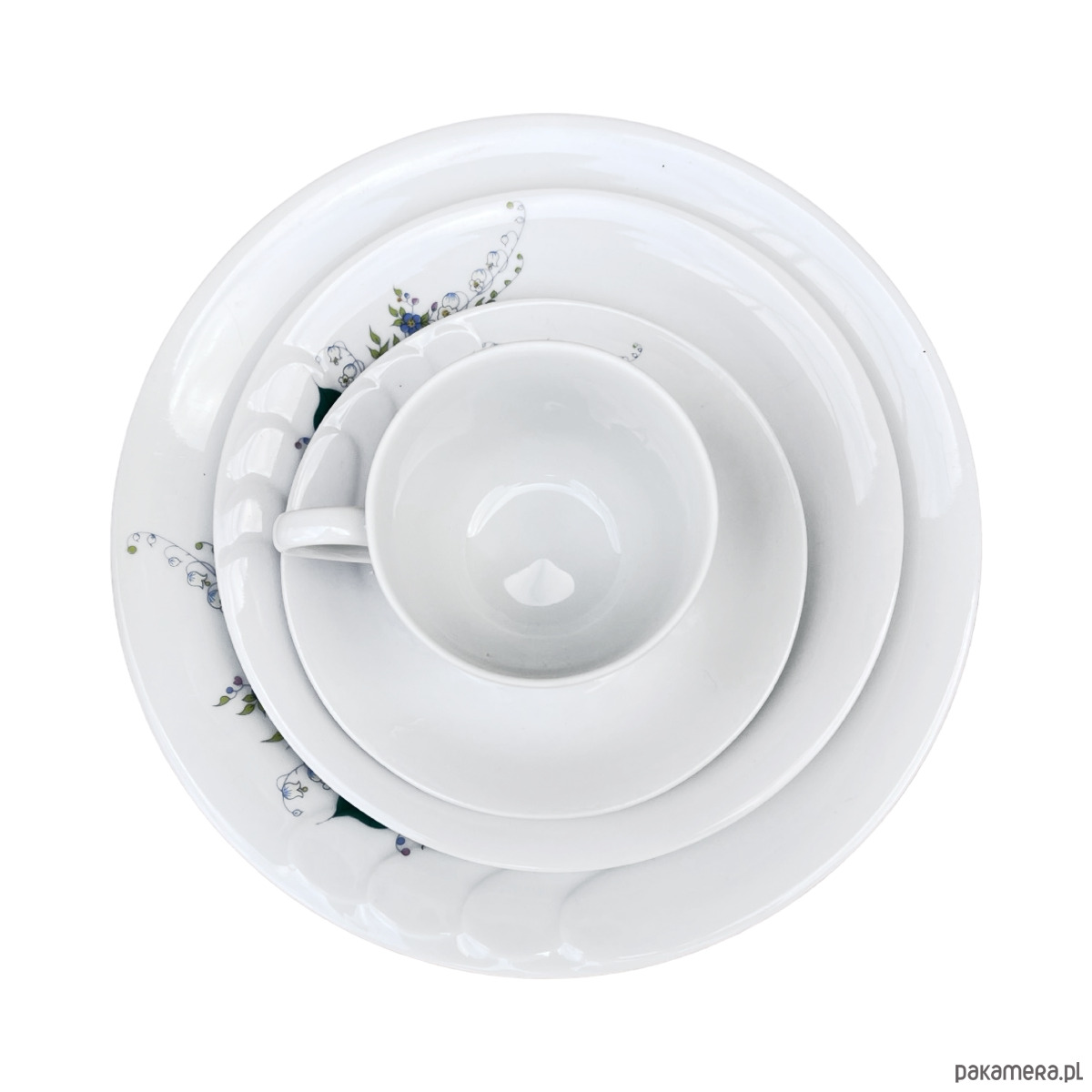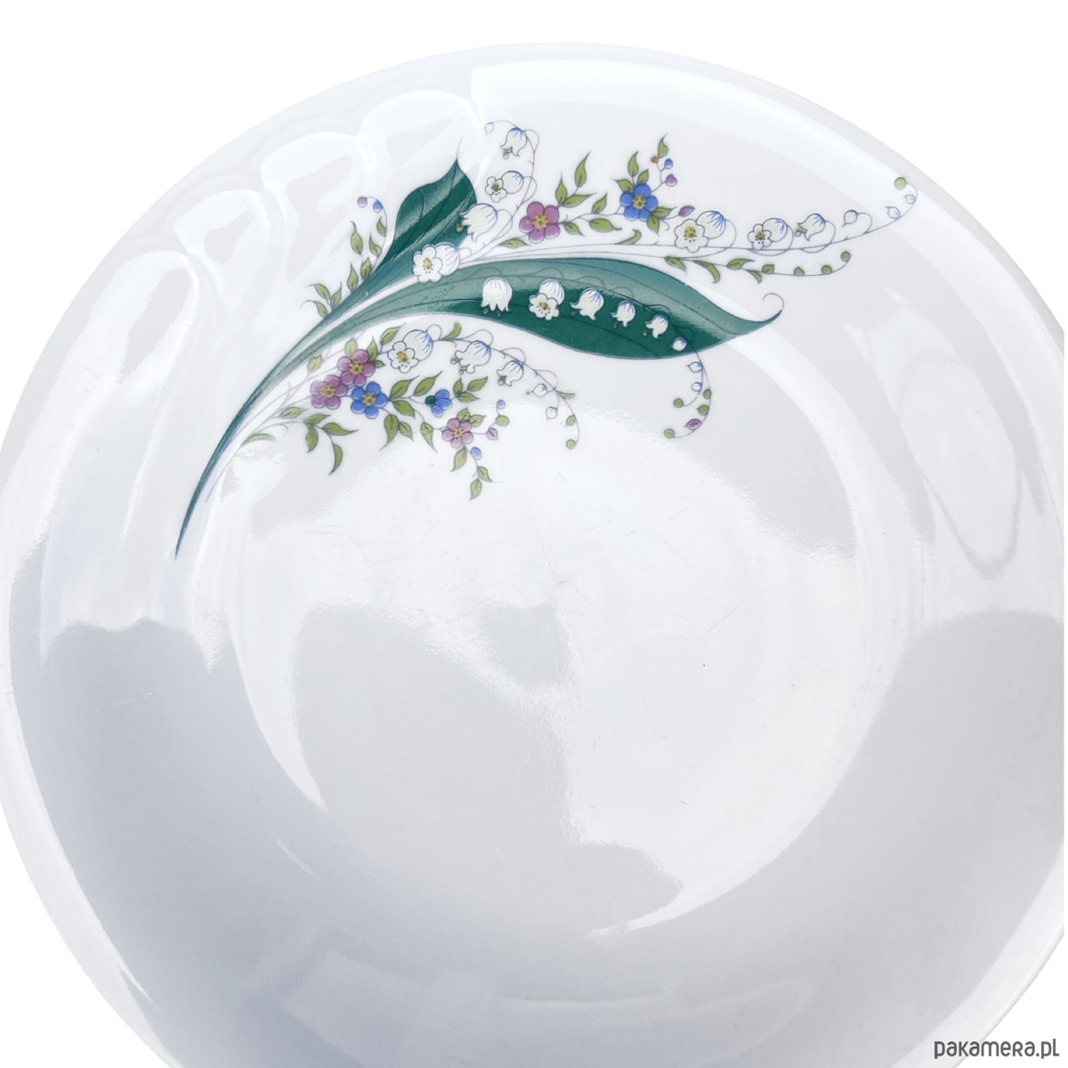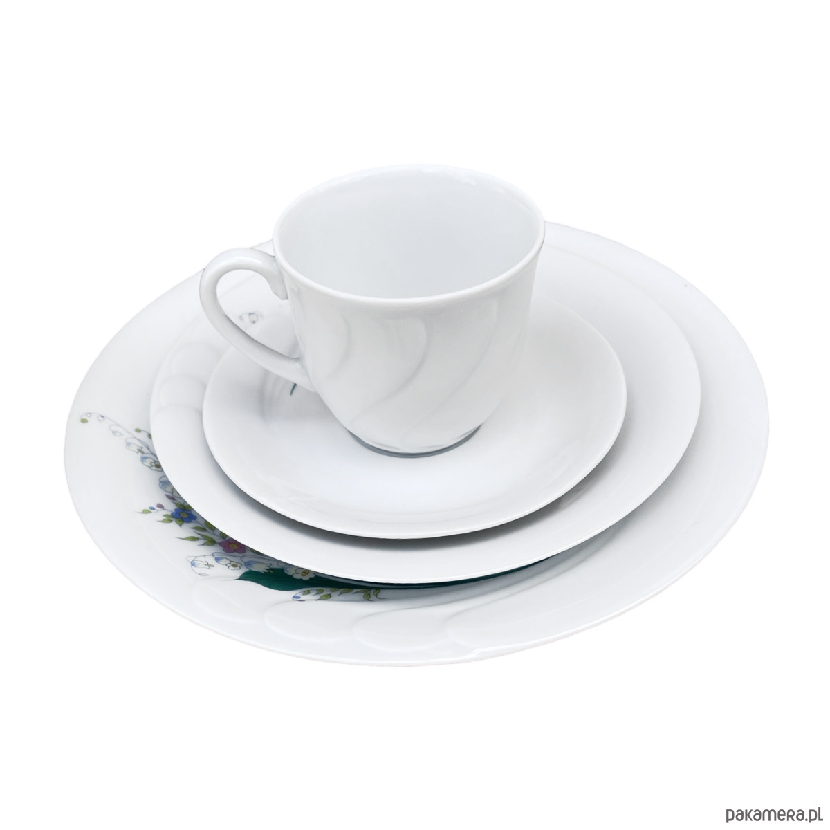 Ciekawy zestaw śniadaniowy wyprodukowany przez Zakłady Porcelany Stołowej "Wawel" / "Krzysztof" w Wałbrzychu w drugiej połowie XX wieku. Zestaw składa się z filiżanki, spodka, małego talerzyka i dużego talerza. zestaw zdobiony kalkomanią we wzór konwalii. Powiększony zestaw śniadaniowy czteroczęściowy, przedmiot sygnowany.
