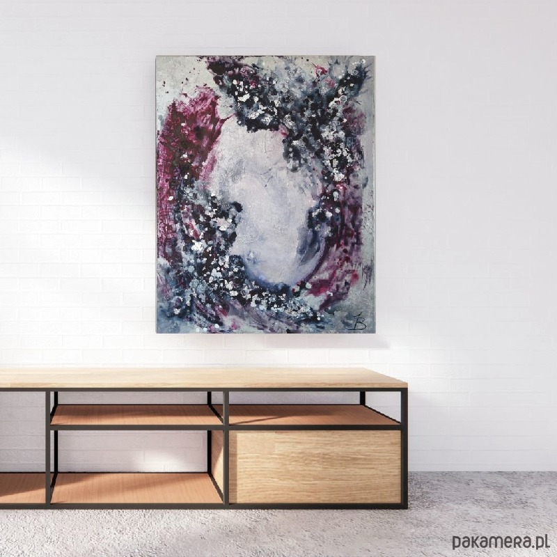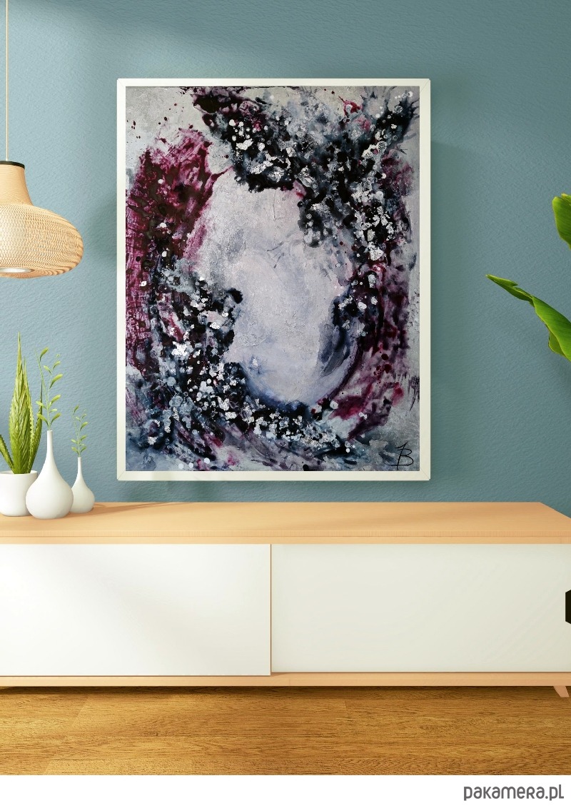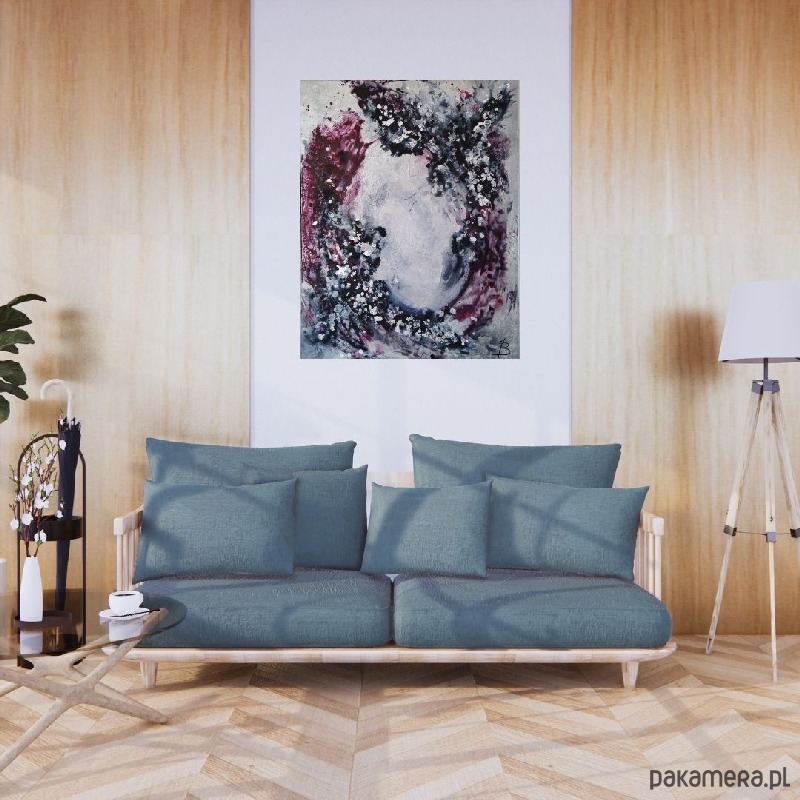 Obraz abstrakcyjny malowany farbami akrylowymi na dobrej jakości podobraziu bawełnianym produkcji polskiej, zabezpieczony werniksem, sygnowany. Boki są przedłużeniem obrazu, dzięki czemu nie wymaga dodatkowej oprawy.