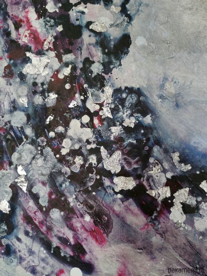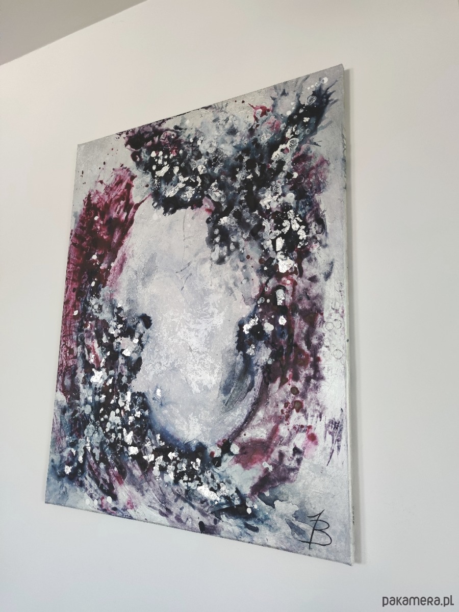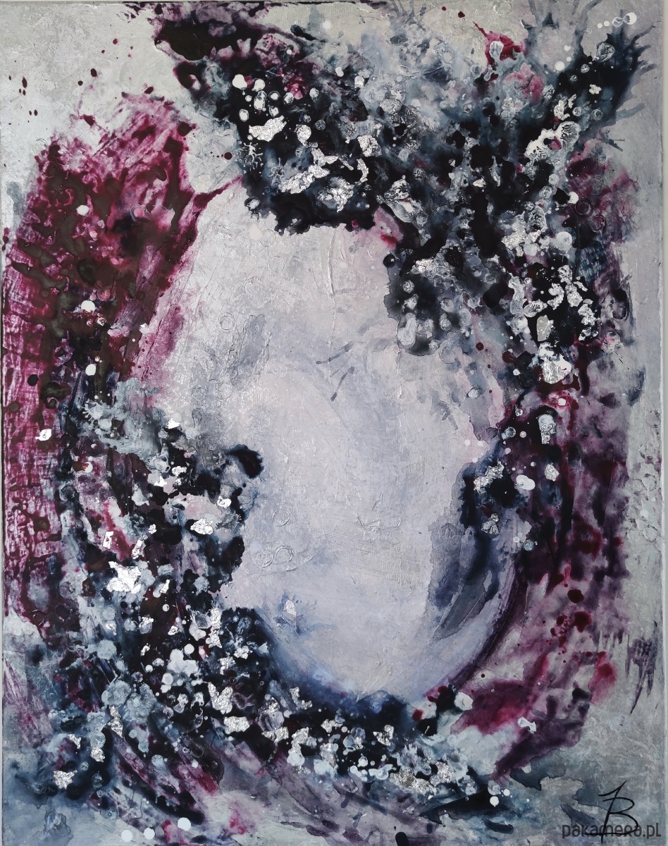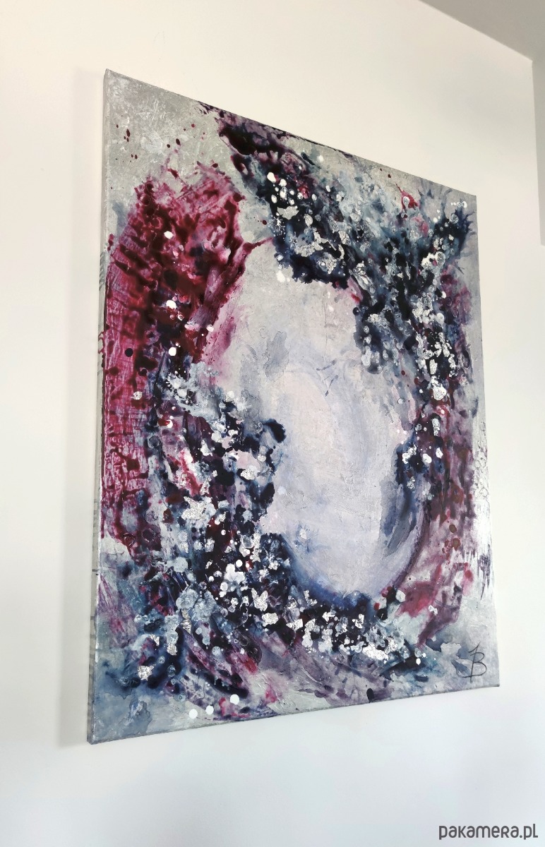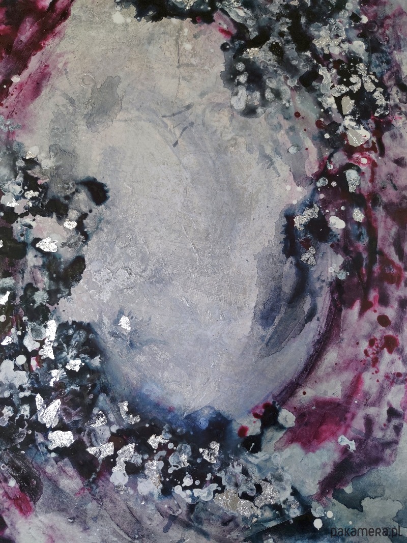 Taniec granatu i purpury na głębokim, wielowarstwowym tle. Pociągnięcia szpachli i kolory tworzą kształt portalu, oprószonego srebrnymi płatkami szlagmetalu. Widoczne wyraźne struktury, tworzące dynamikę pomimo oszczędnej kolorystyki. Zaproszenie do przejścia.