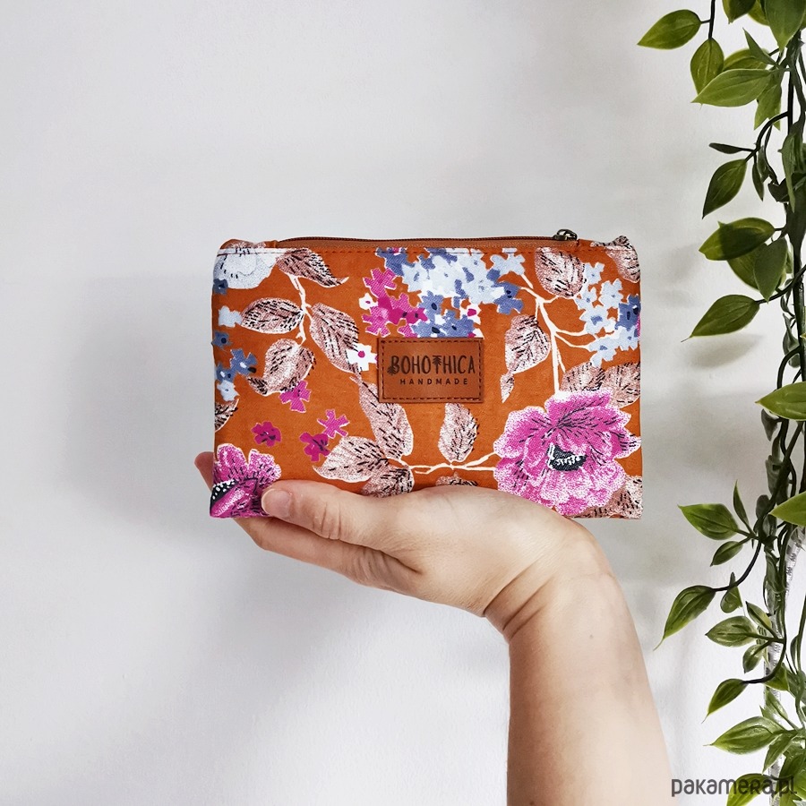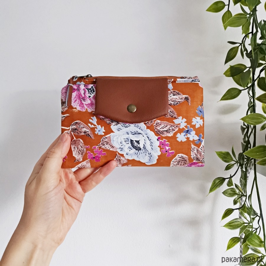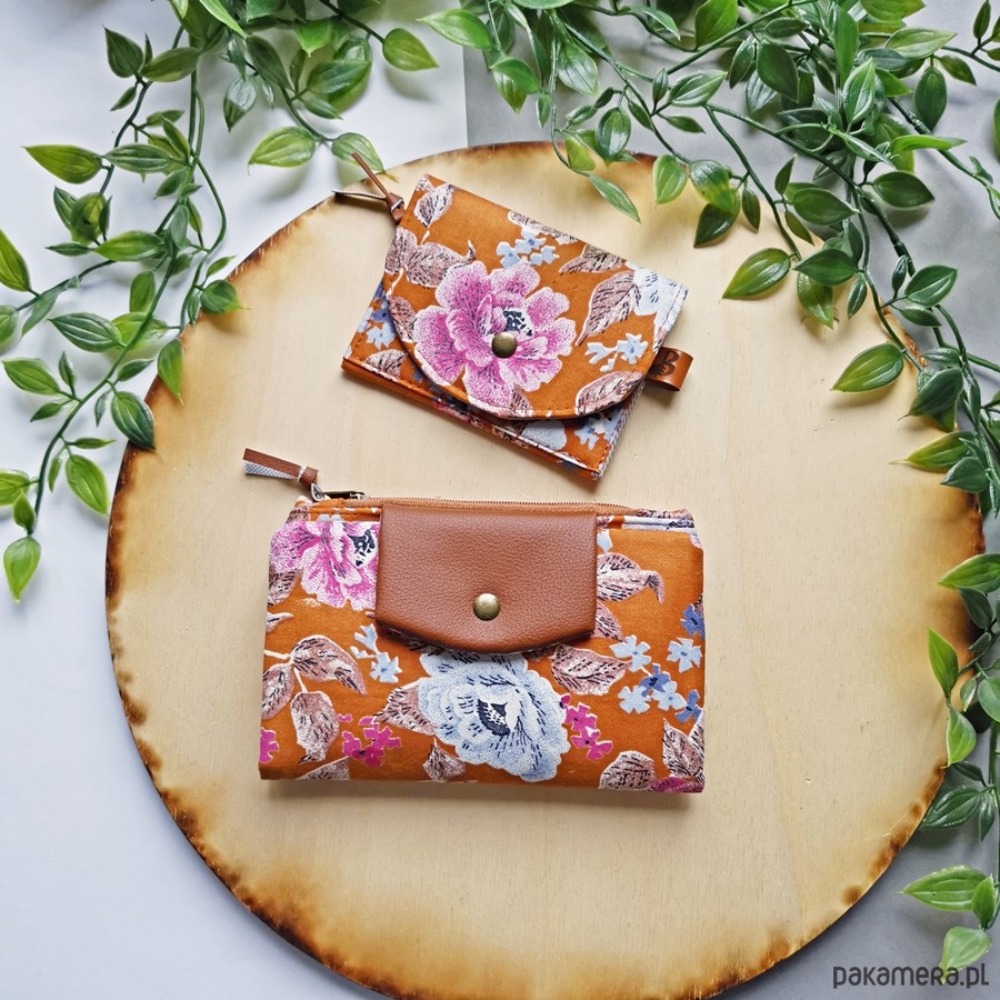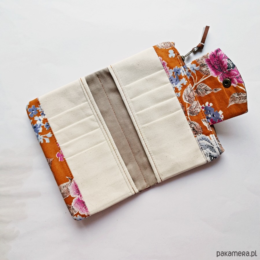 Pojemny portfel uszyty został z grubej zasłony z drugiej ręki w piękny roślinny wzór, powstał w duchu zero waste.