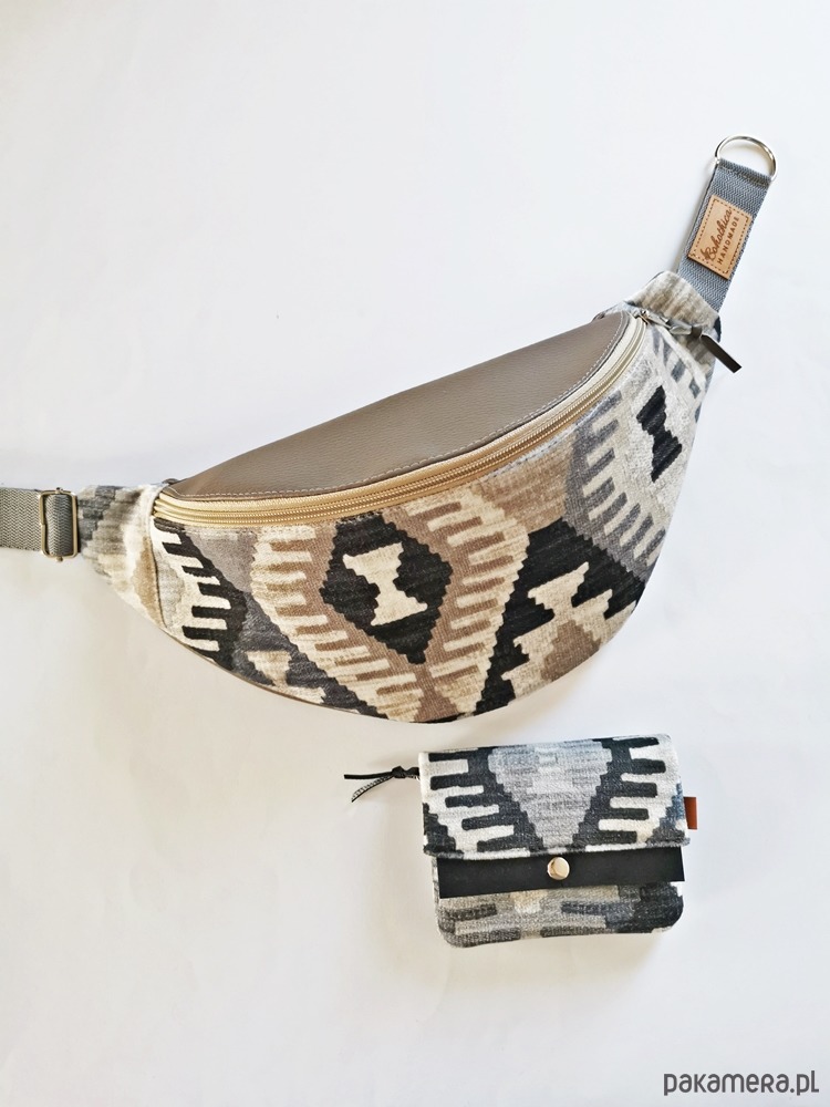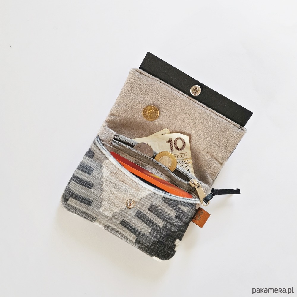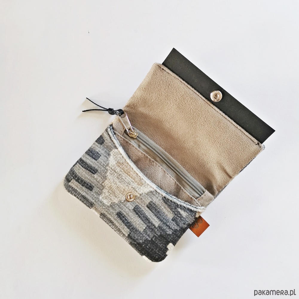 Portfelik uszyty został z tkaniny welurowej w aztecki wzór.