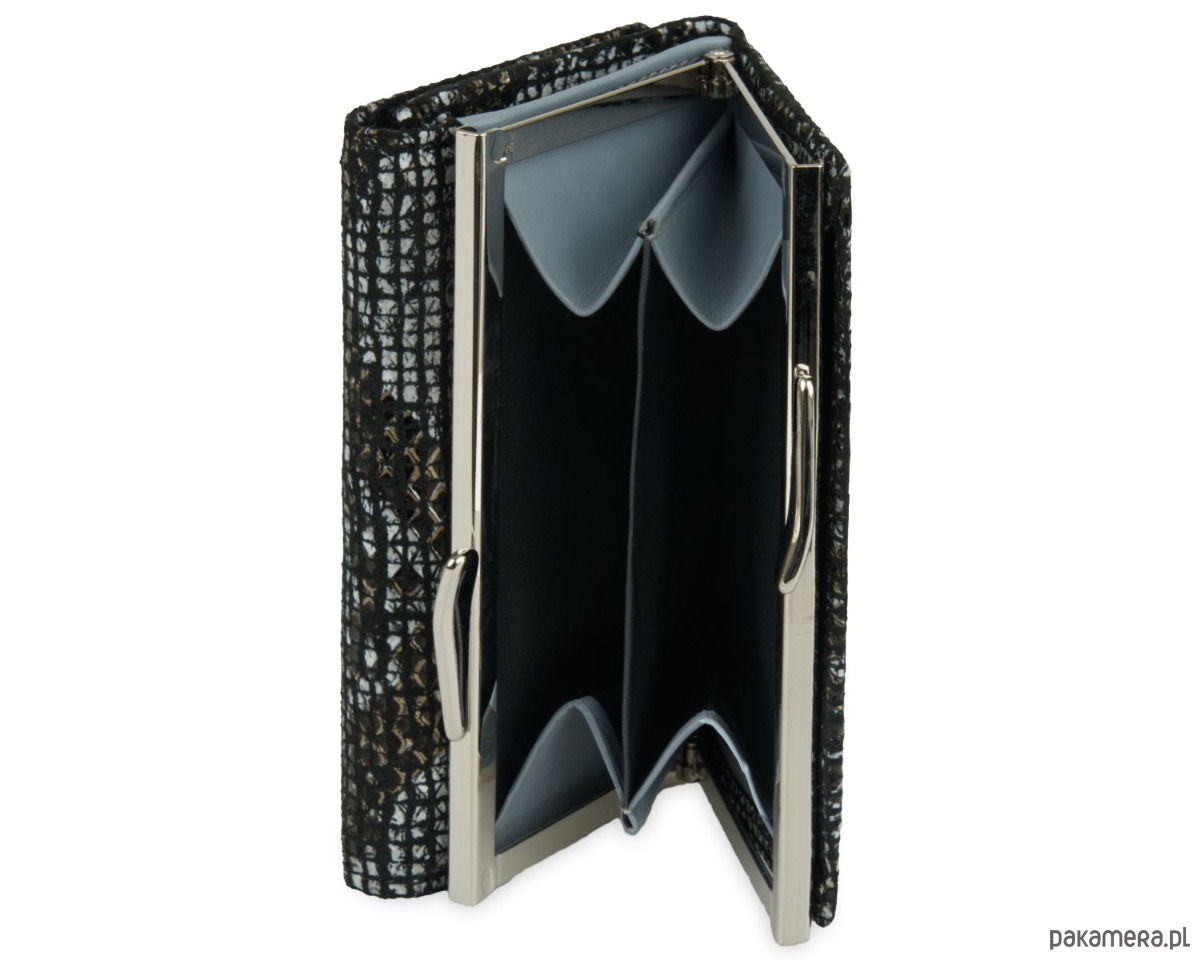 Portfel damski w zwierzęcy wzór wykonany ze skóry naturalnej. W środku wyłożony skórą naturalną w szarym kolorze. Model ten jest małych rozmiarów, dzięki czemu zmieści się w niemal każdej damskiej torebce. W zewnętrznej części portfela znajduje się kieszonka na monety zapinana na bigiel.