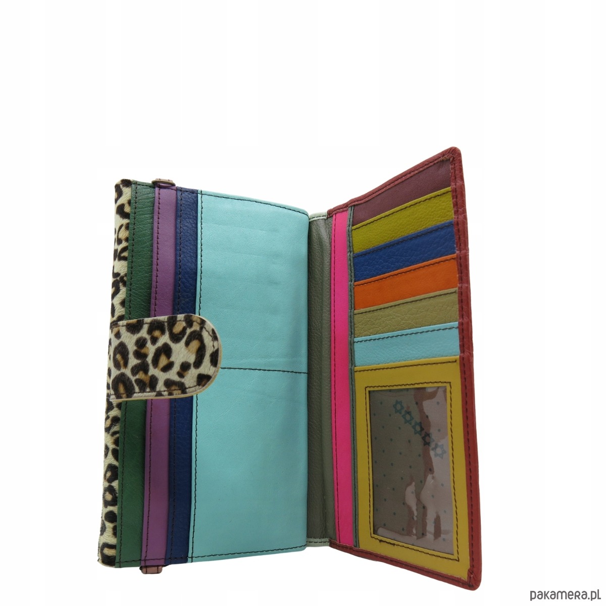 druga część z licznymi przegrodami na karty, wizytówki i zdjęcia zamykana na pasek z magnesem
