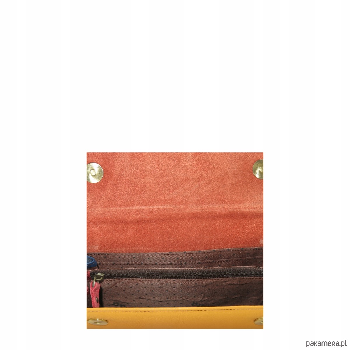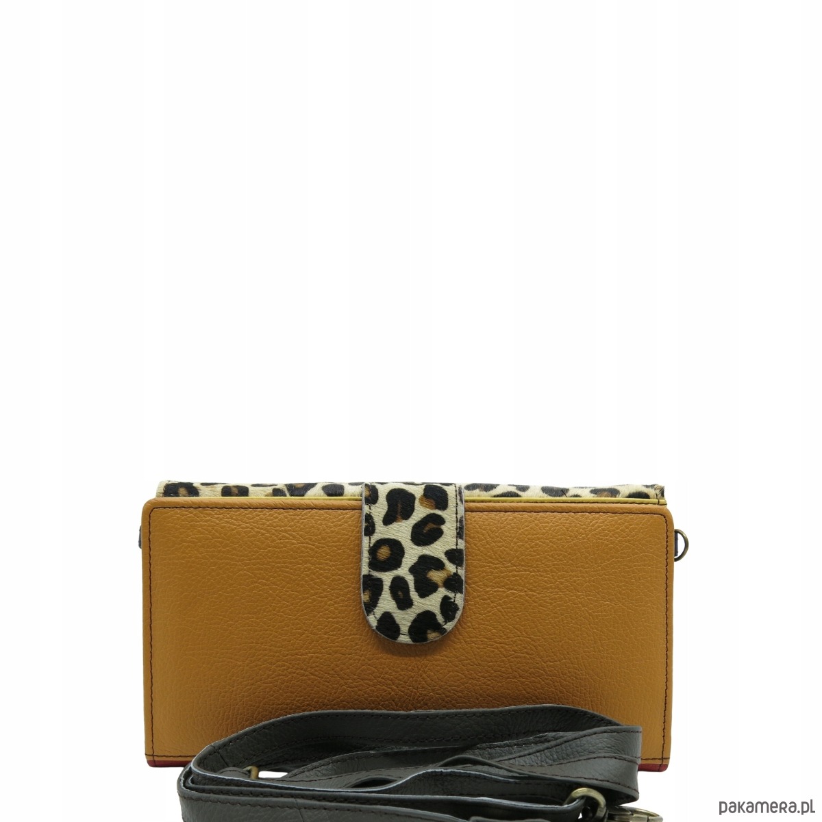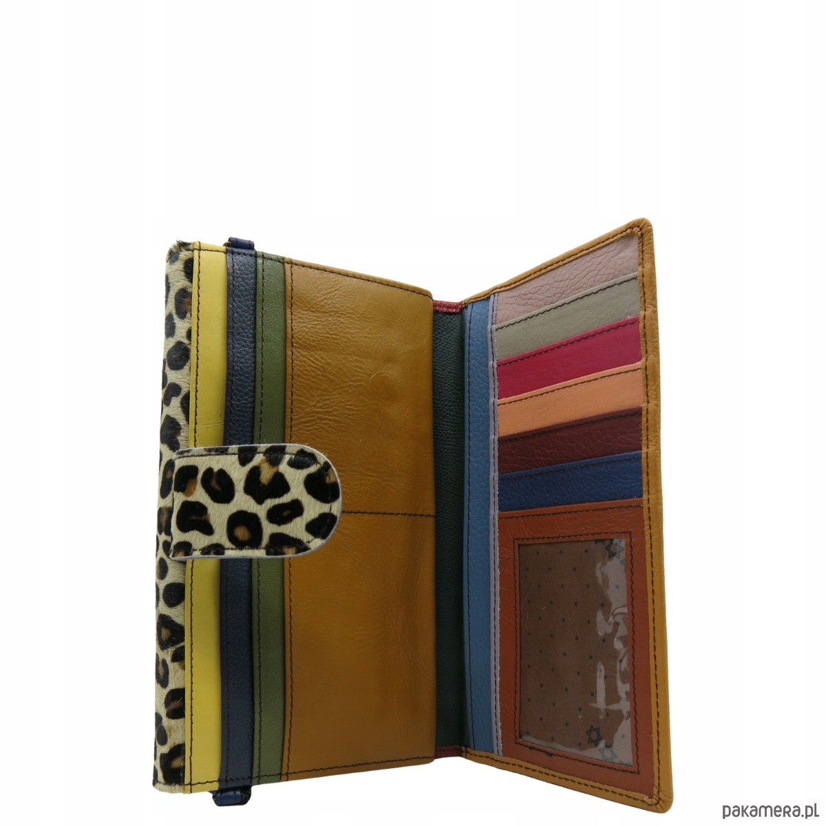 druga część z licznymi przegrodami na karty, wizytówki i zdjęcia zamykana na pasek z magnesem