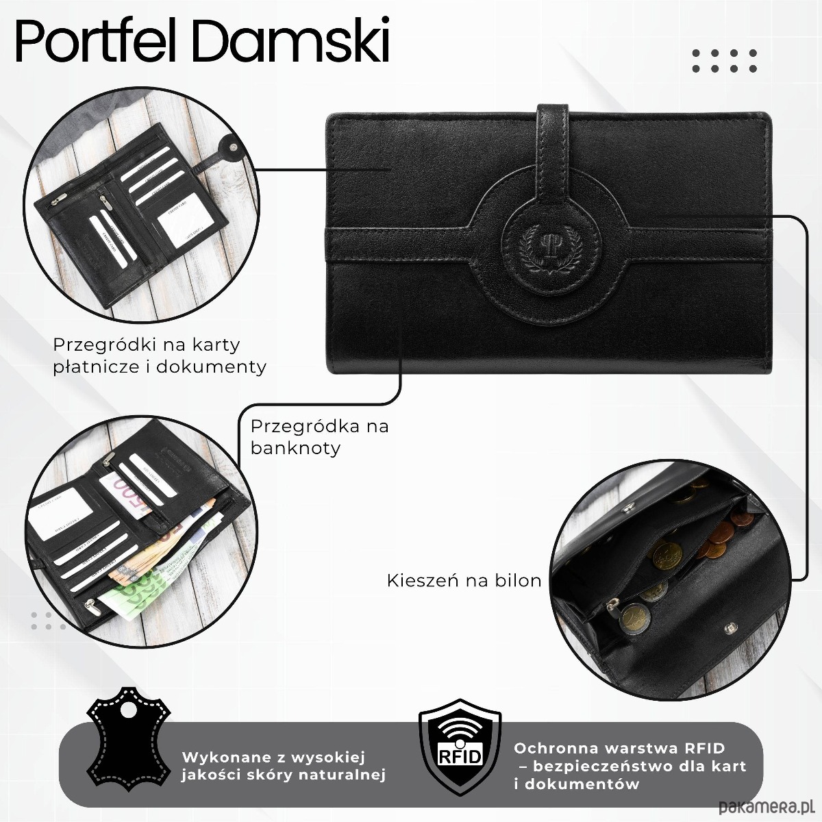 - Właściwości: z okienkiem, z miejscem na zdjęcia, z kieszenią na monety, RFID protection