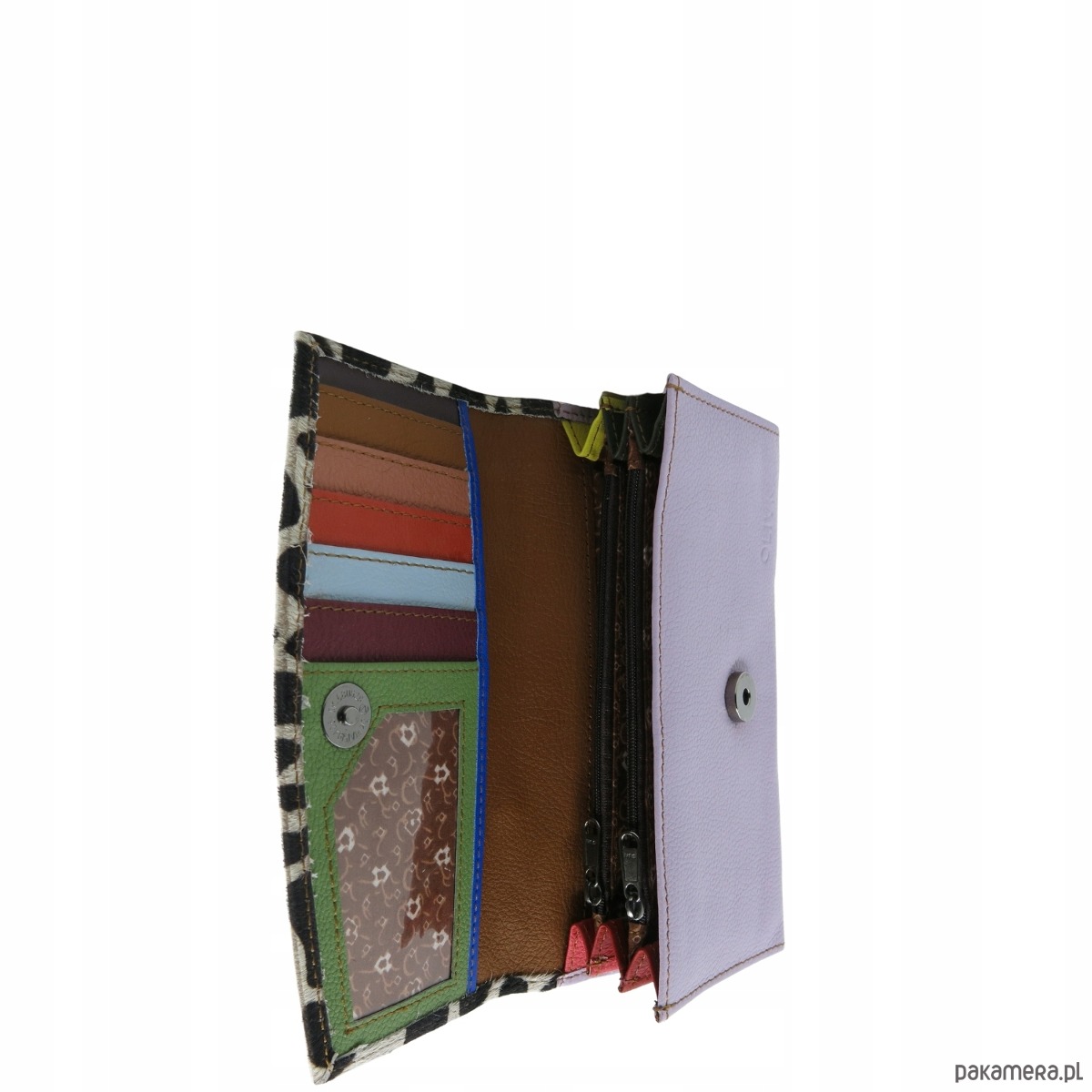 Średniej wielkości portfel wykonany ze skrawków skóry naturalnej. Jego unikalne połączenie kolorystyczne nadaje mu niepowtarzalny charakter, czyniąc go doskonałym dodatkiem. Spełni oczekiwania nawet najbardziej wymagających kobiet, a dzięki regulowanej rączce można go nosić jak kopertówkę!