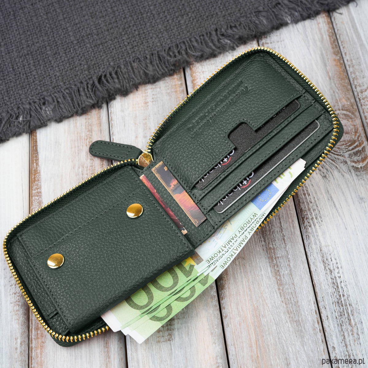 - Właściwości: kompaktowy, z kieszenią na monety, RFID protection