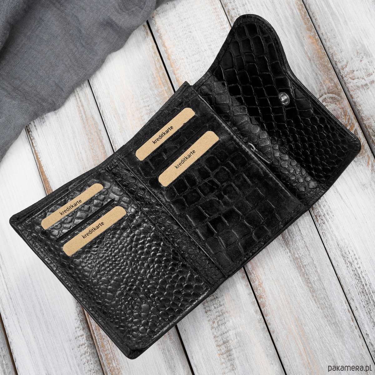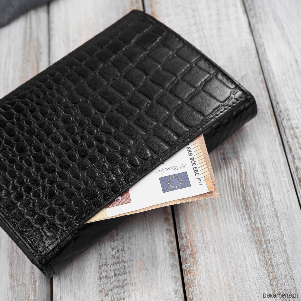 Portfel damski skórzany mały czarny croco w orientacji poziomej RFID