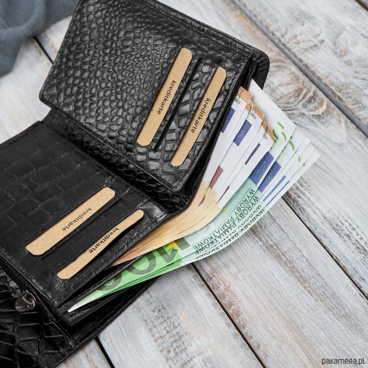 - Właściwości: RFID protection, z kieszenią na monety, z miejscem na zdjęcia, kompaktowy