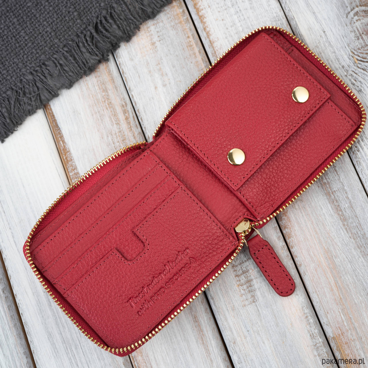 Portfel damski skórzany mały czerwony w orientacji poziomej z ochroną RFID KV-04-RD