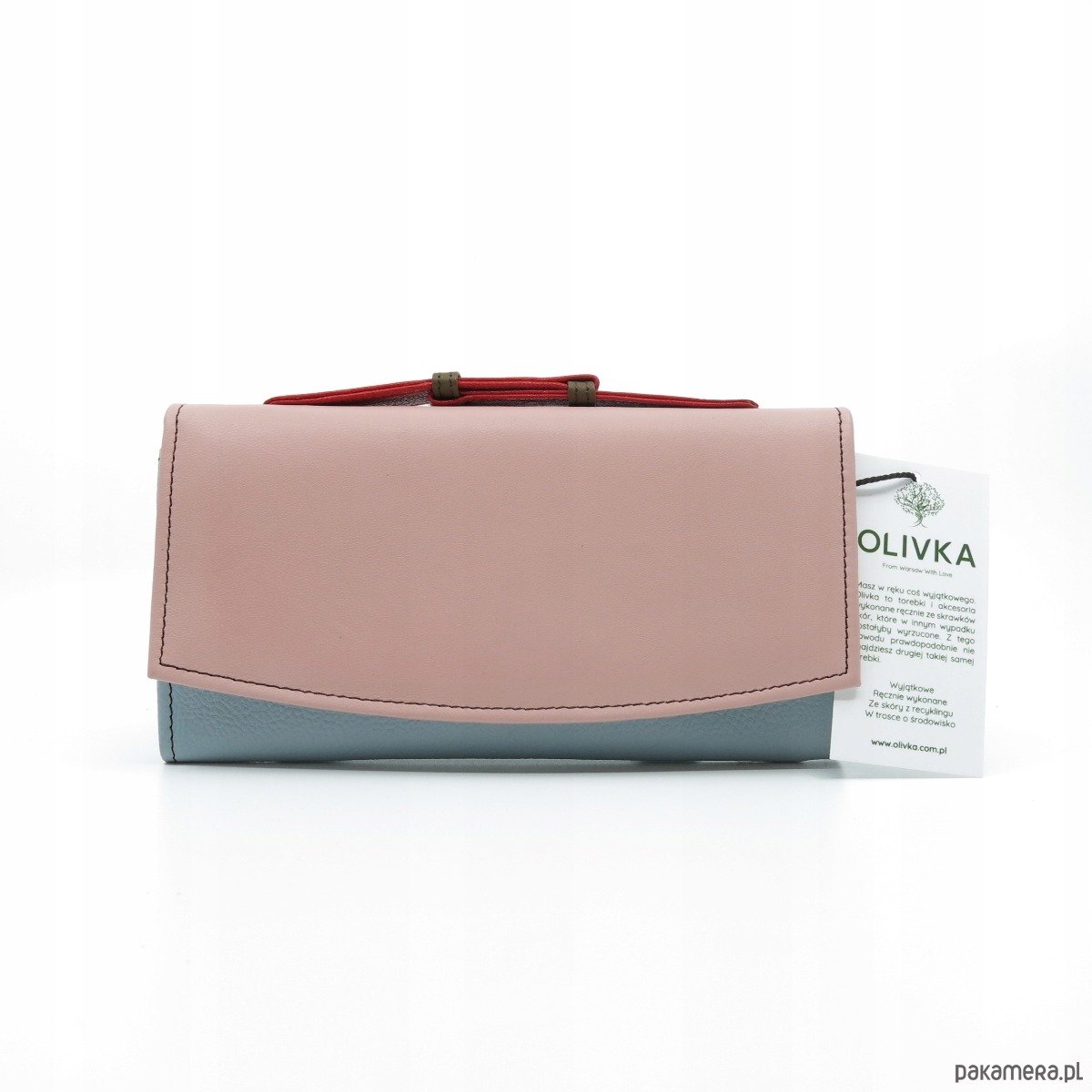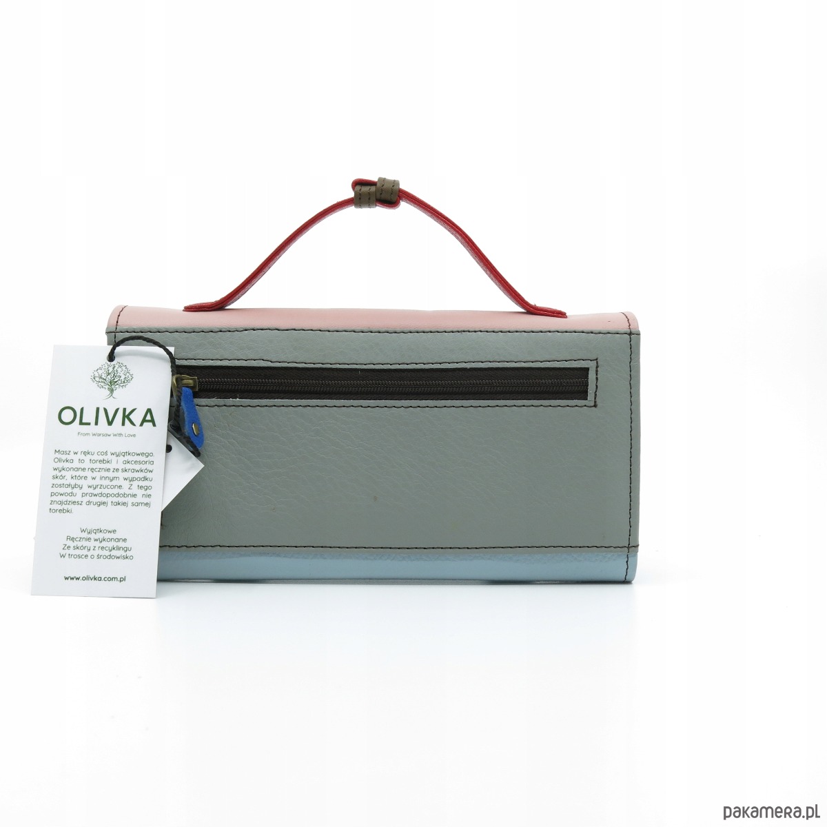 Portfel damski skórzany ze skrawków rączka dużo przegródek eko Olivka