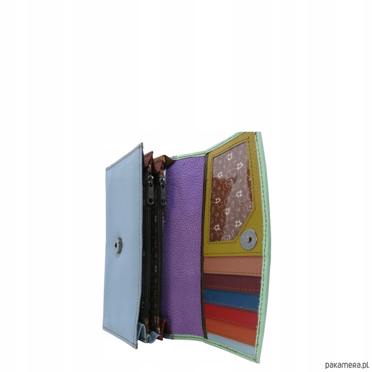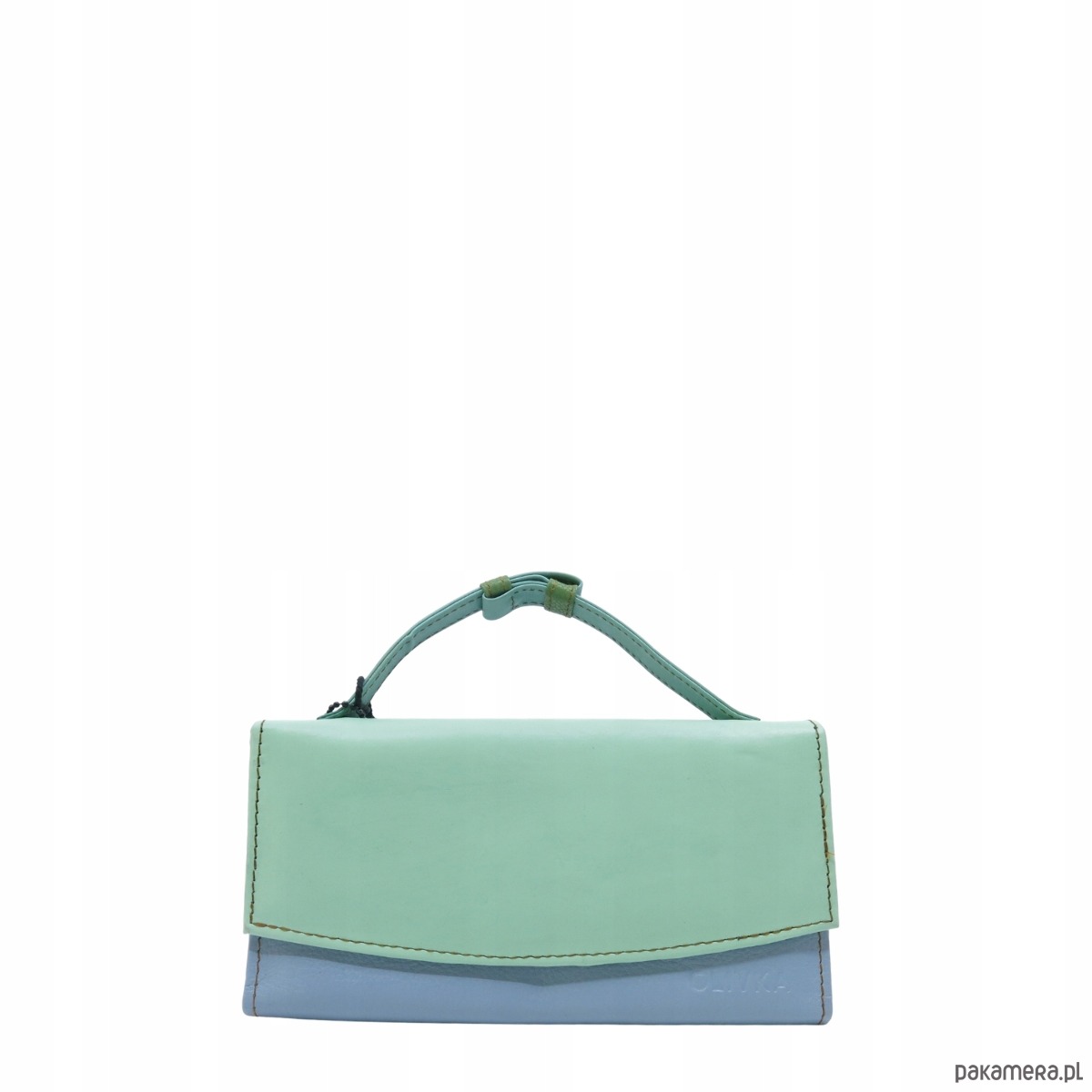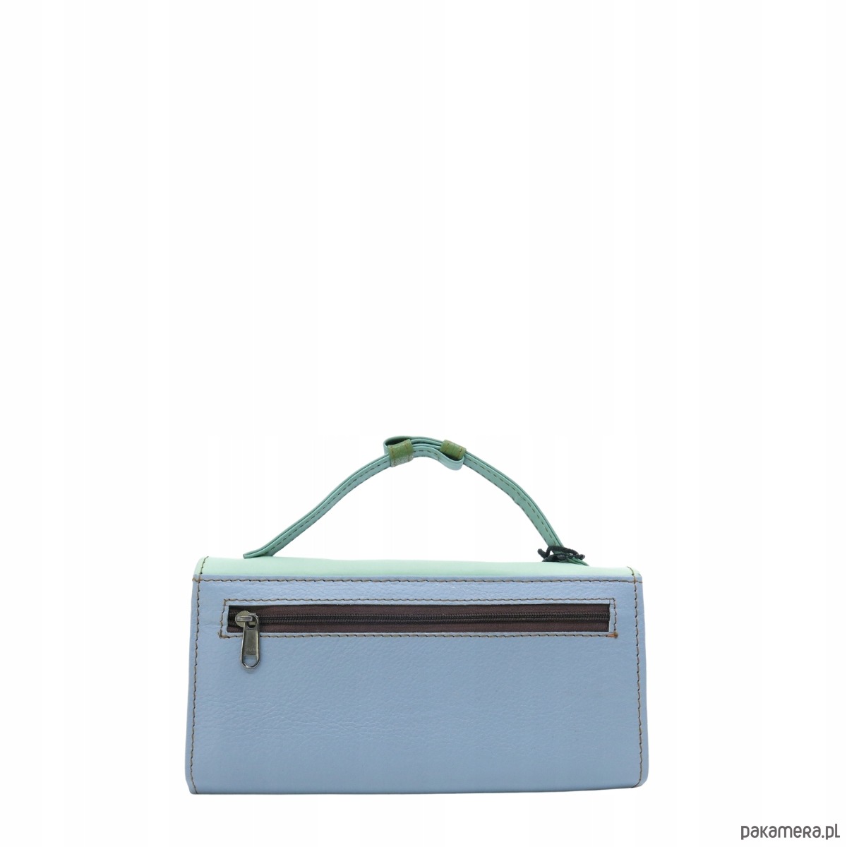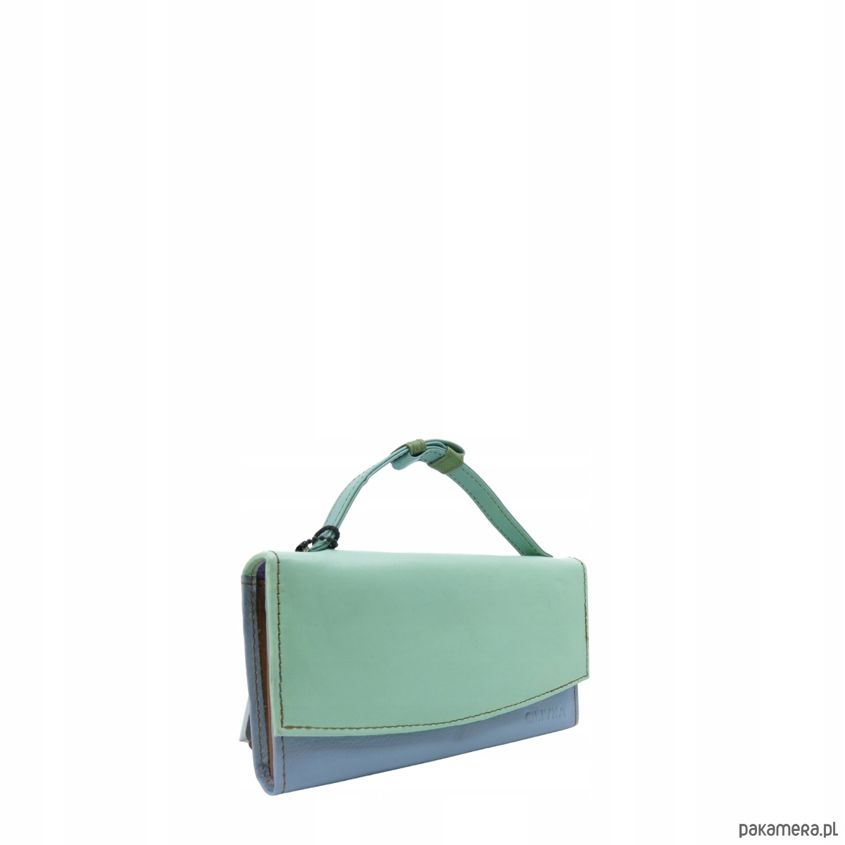 Portfel damski skórzany ze skrawków rączka dużo przegródek eko OLIVKA