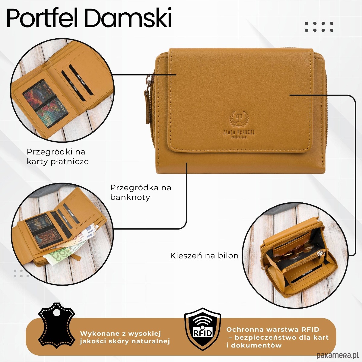 Portfel damski skórzany żółty duży w orientacji poziomej z RFID Paolo Peruzzi SL-07-MNG