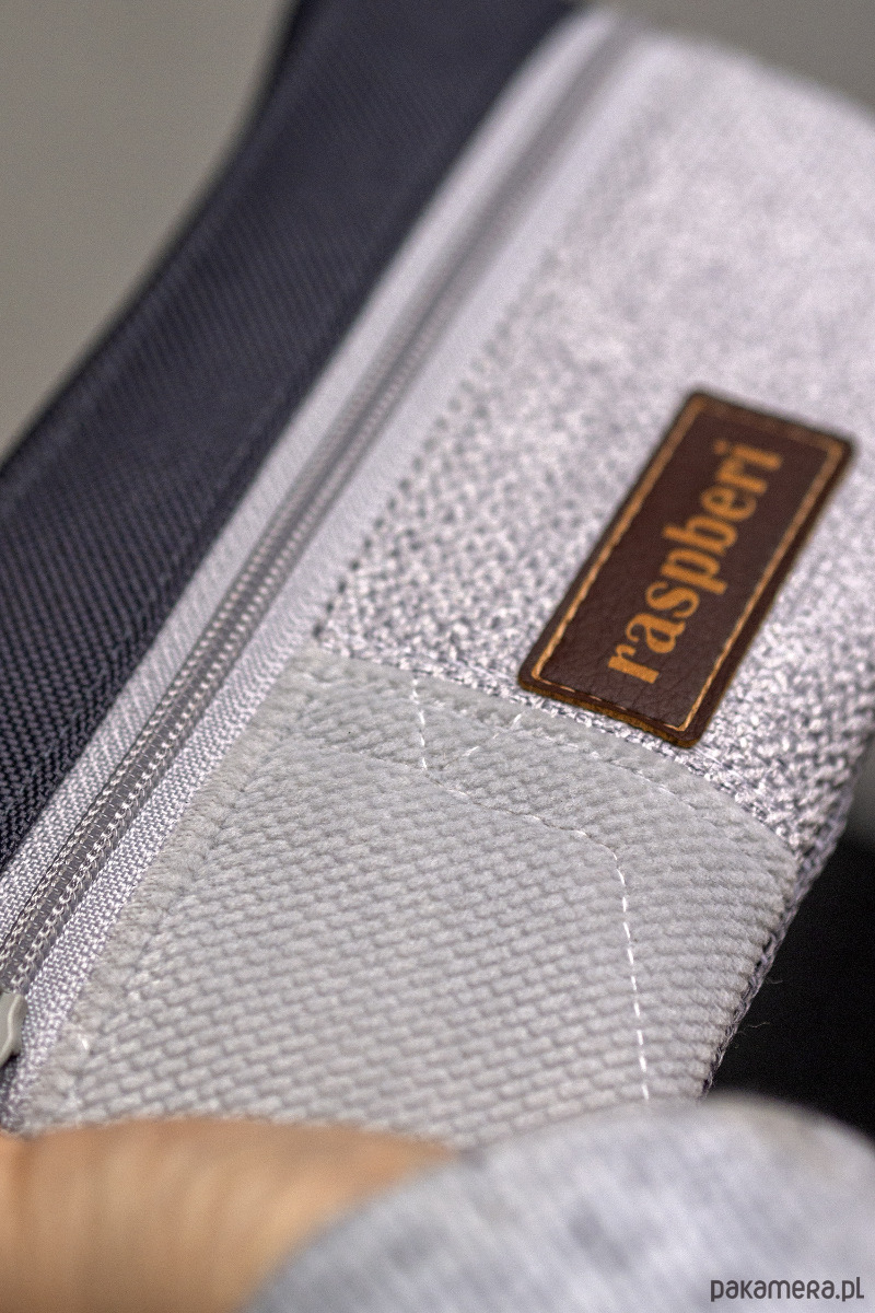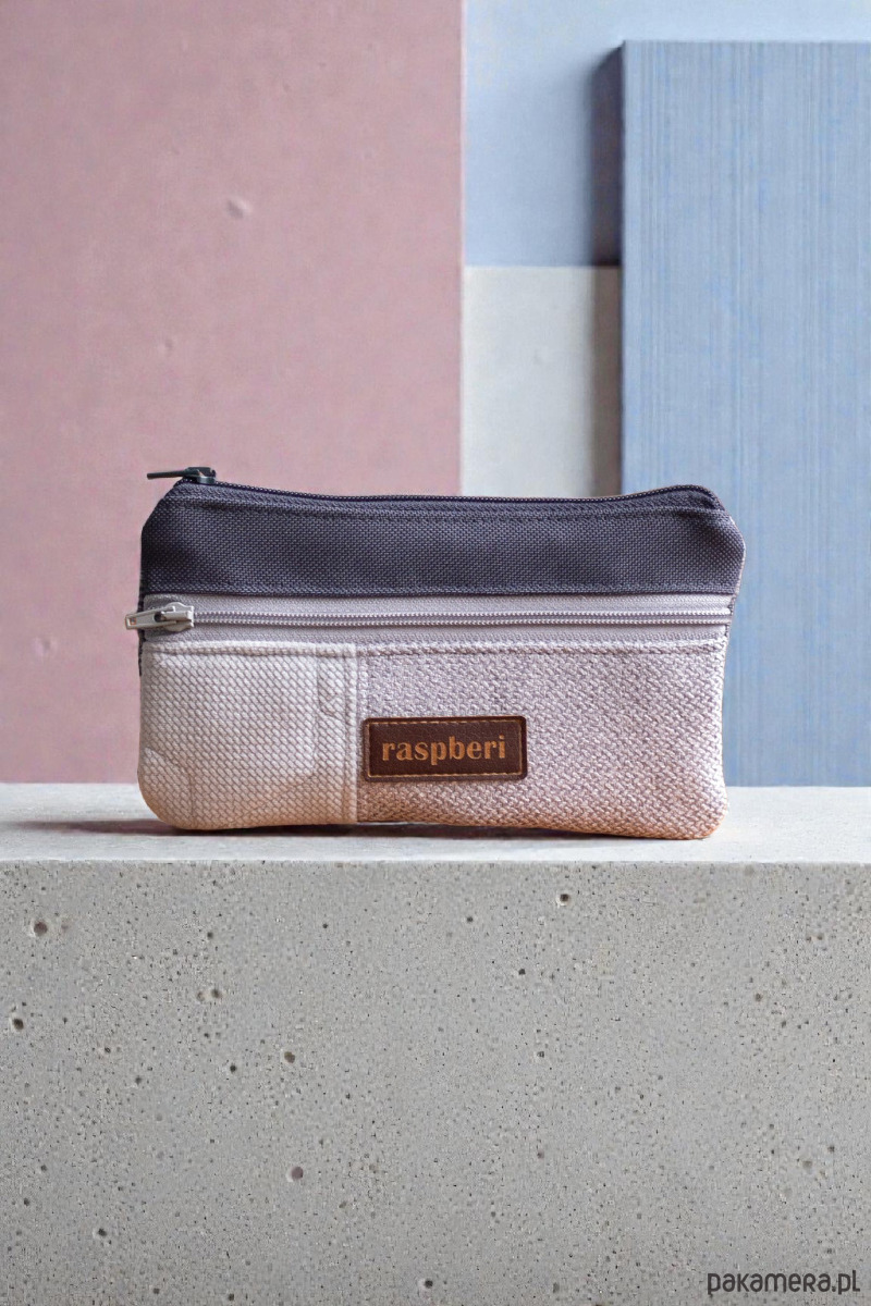 Prosty wodoodporny portfel wykonany z kilku rodzajów tkanin w odcieniach szarości.