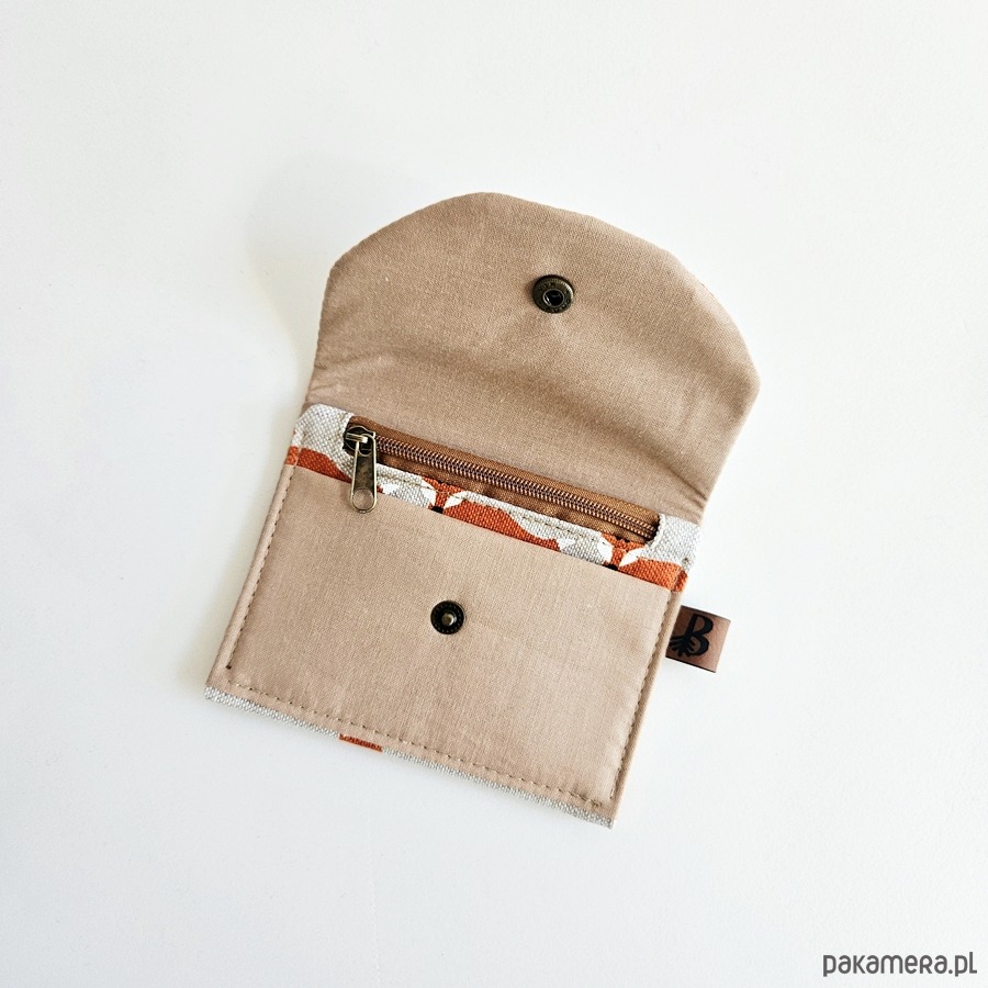 Portfelik powstał z tkaniny bawełnianej w liskowy wzór oraz beżowej bawełny.