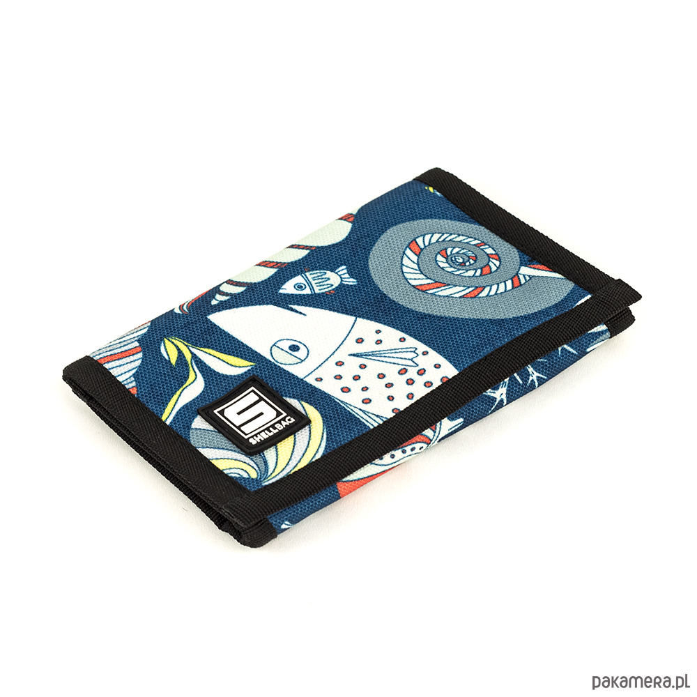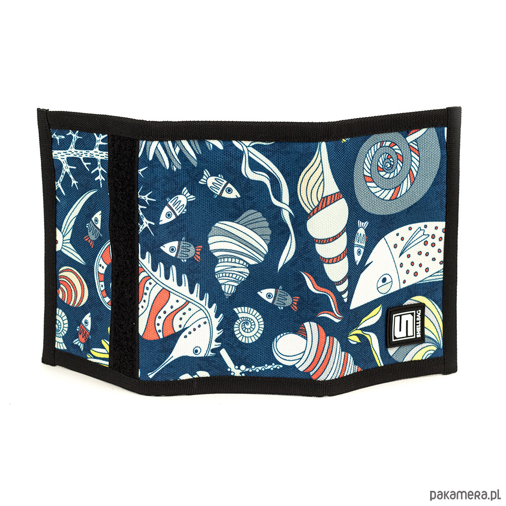 Granatowy portfel z grafiką przedstawiającą morskie żyjątka od ryb po glony i rafę koralową do doskonałe rozwiązanie dla dzieci i dla mamy.