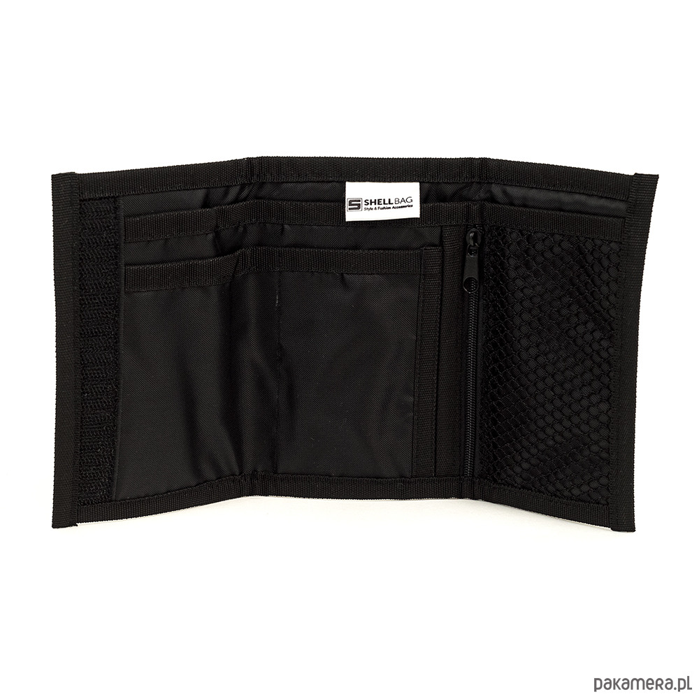 Wewnątrz posiada dużą komorę na banknoty, kieszonkę na monety zapinaną na zamek oraz przegrody na karty bankomatowe.