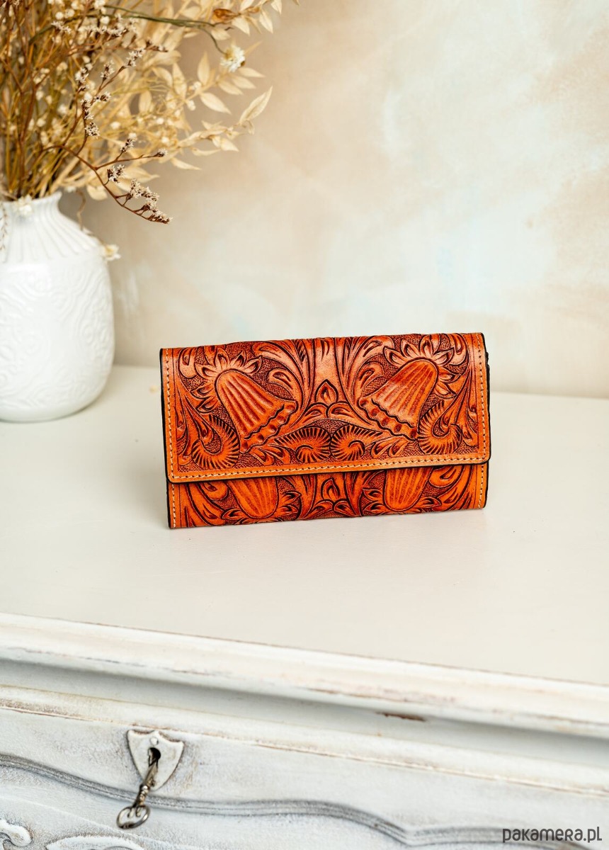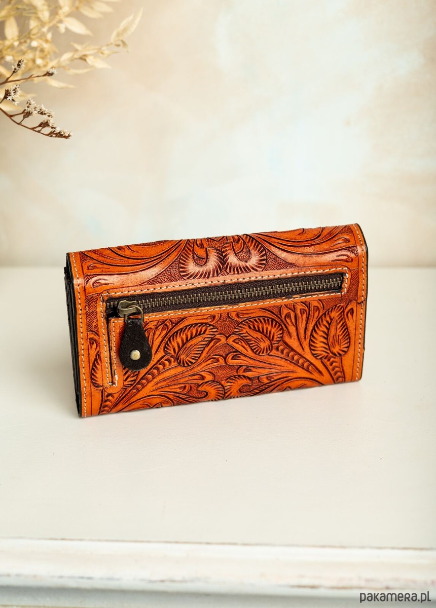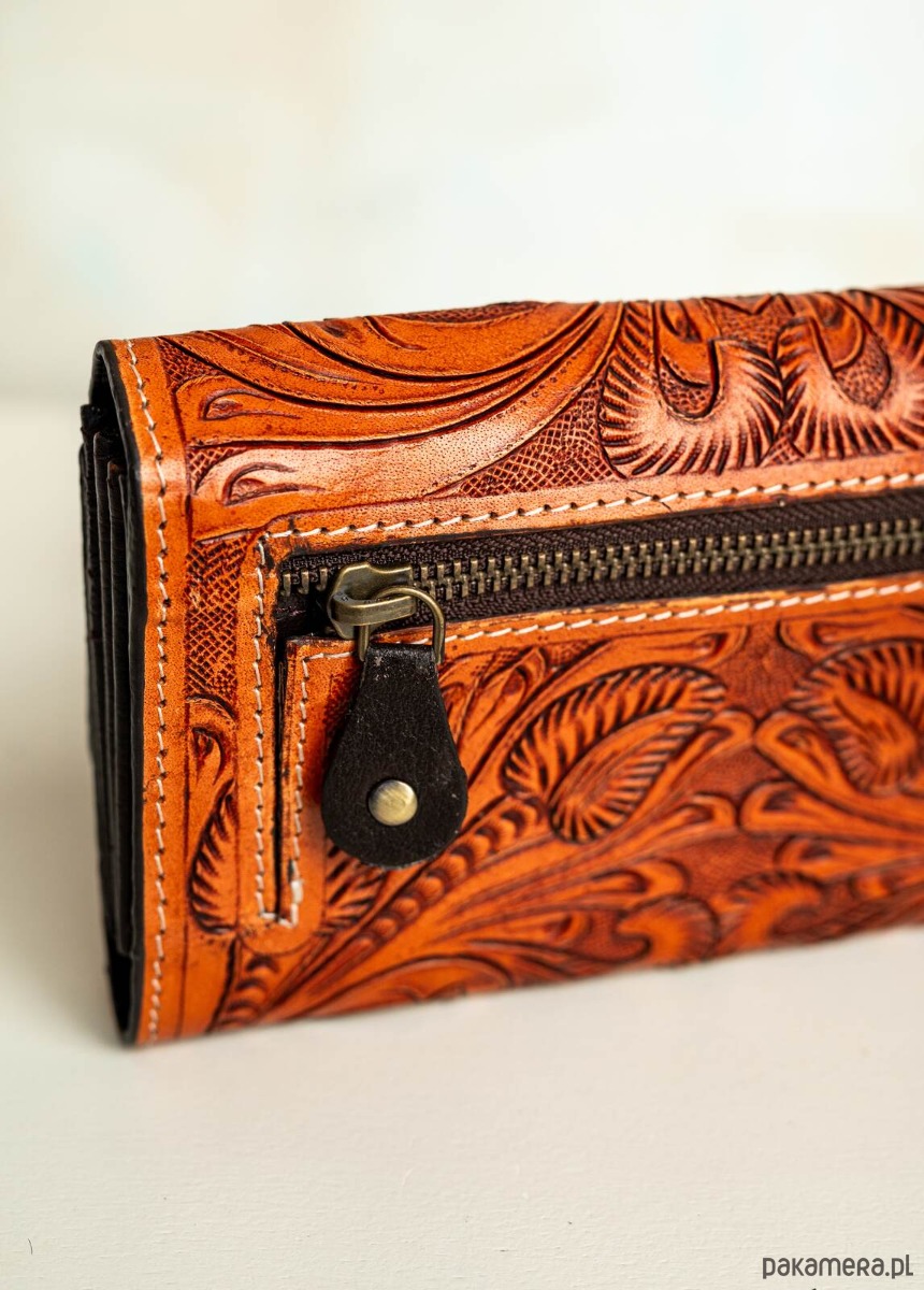 Unikatowy portfel, stworzony ręcznie w Indiach. Wykonany z wysokiej jakości skóry, która z czasem nabiera charakteru i naturalnego połysku. Motywy rzeźbione na powierzchni portfela podkreślają indywidualność i ręczne wykonanie, każdy egzemplarz jest niepowtarzalny. Kieszenie i przegrody są zaprojektowane z myślą o maksymalnej funkcjonalności, mieszcząc karty, banknoty i monety. Produkt odznacza się trwałością i dbałością o szczegóły, co czyni go idealnym dodatkiem na lata.
