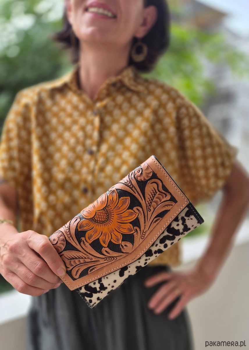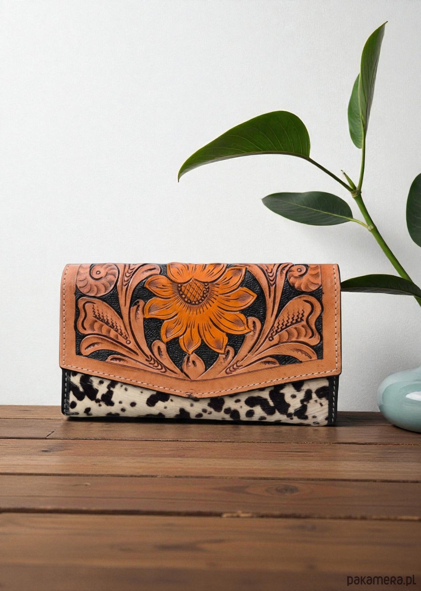 Portfel zdobiony ręcznym rzeźbieniem w skórze oraz naturalnymi łatkami, wykonany w Indiach. To unikatowy dodatek, łączący tradycyjne rzeźbienia z charakterem używanych skór i widocznym włosiem, które nadają mu niepowtarzalny wygląd. Wykonany z wysokiej jakości skóry, która z czasem nabiera patyny i naturalnego połysku, podkreślając ręczne detale. Ręczne rzeźbienie prezentuje misternie wycięte motywy, a łatki skóry dodają eklektycznego uroku i autentyczności. Kieszenie i przegrody zaprojektowano z myślą o maksymalnej funkcjonalności, mieszcząc karty, banknoty i monety. Dlatego portfel łączy trwałość z oryginalnym stylem, będąc wyrazistym dodatkiem na co dzień lub na specjalne okazje. Każdy egzemplarz jest niepowtarzalny, ponieważ ręczne wykonanie gwarantuje subtelne różnice w każdym detalu.
