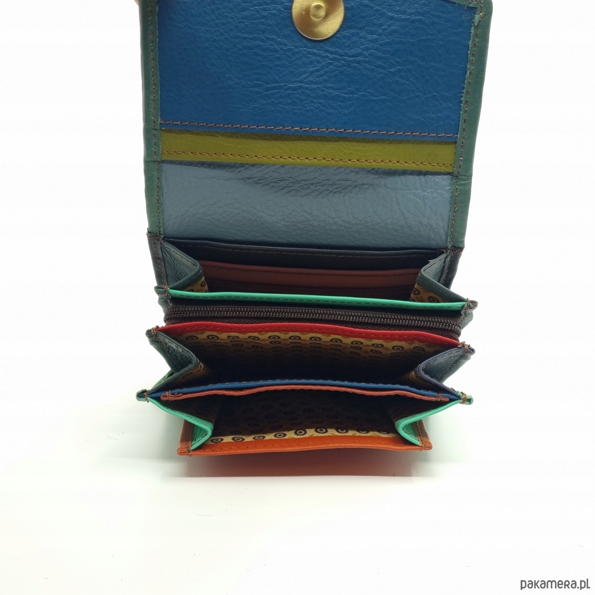 Średniej wielkości portfel wykonany ze skóry naturalnej. Wyjątkowe połączenie kolorystyczne sprawia, że nigdzie nie znajdziesz takiego samego!