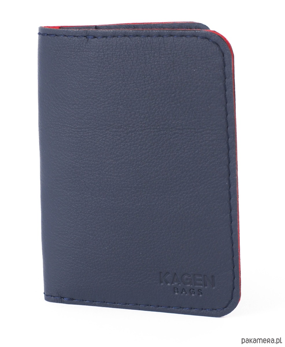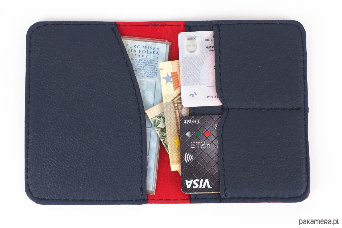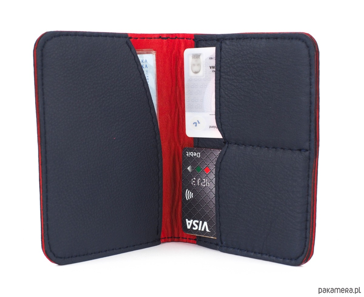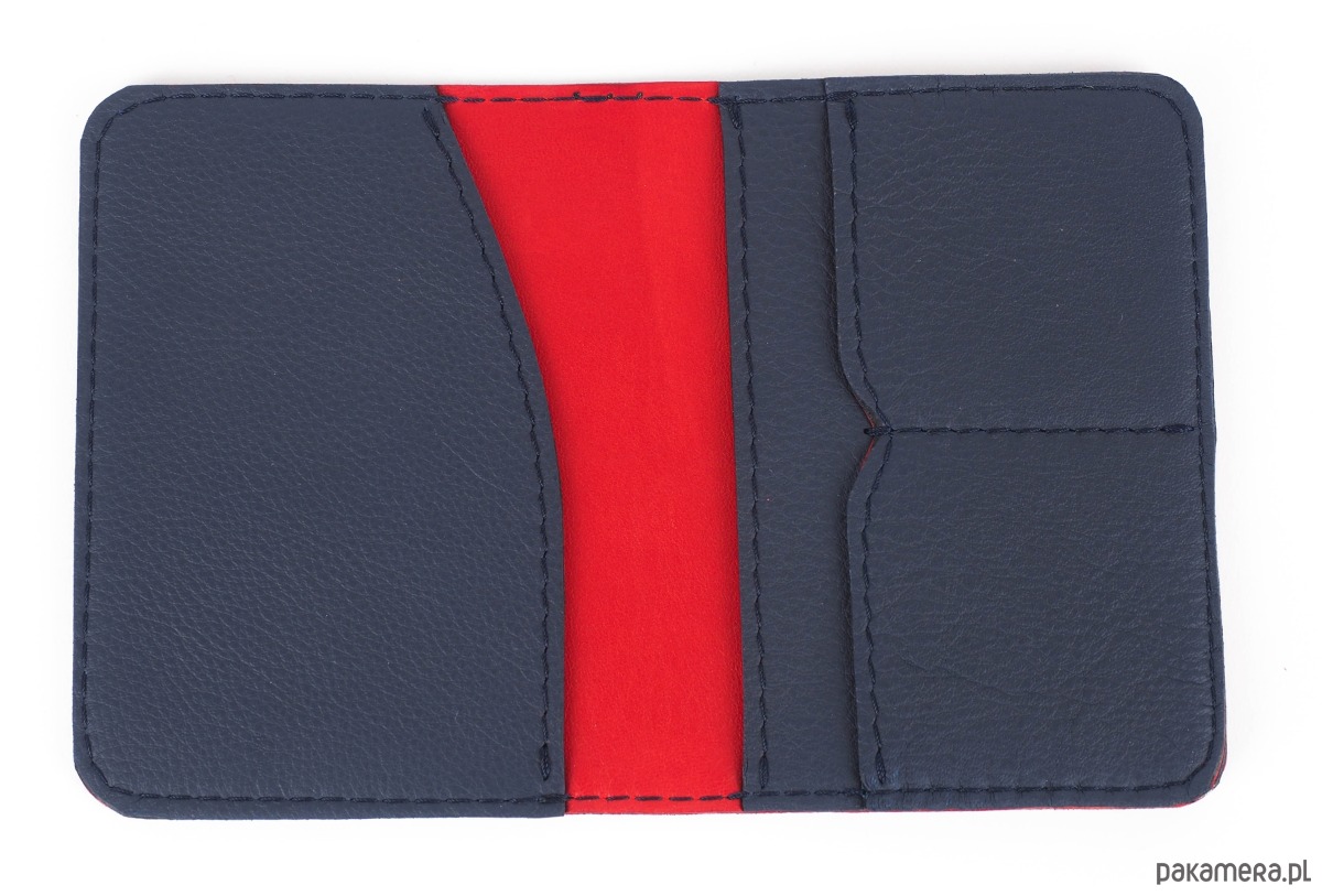 Minimalistyczny portfel w wersji slim, idealny na banknoty, dokumenty, pomieści dowód rejestracyjny, paszport, karty kredytowe, może służyć również jako wizytownik. Model unisex, doskonały zarówno dla kobiet jak i mężczyzn. Jest wyjątkowo cienki, idealnie nadaje się do noszenia w kieszeni spodni lub marynarki, zmieści się w każdym, najmniejszym nawet fasonie torebki. Bardzo starannie wykonany z granatowej skóry bydlęcej garbowanej roślinnie, podszyty cieniutką skórą kozią w kolorze czerwonym. Ma cztery przegródki. Model występuje również w innych wariantach kolorystycznych. Idealny na prezent.