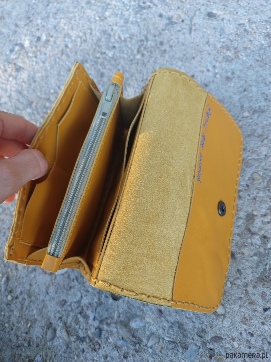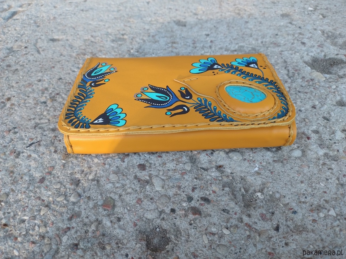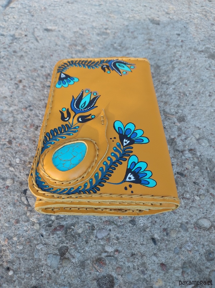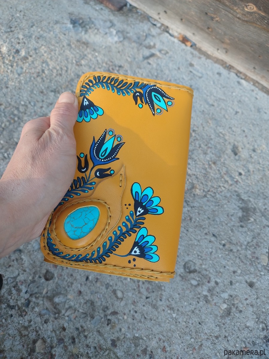 Portfel wykonany ręcznie z naturalnej , impregnowanej skóry w kolorze żółtym .Zszywany naturalnym sznurkiem . Zamykany na napę . Ozdobiony malowanym motywem kwiatów oraz minerałem howlitem. Malowany wzór odporny na działanie czynników atmosferycznych . W środku kieszeń na monety zamykana na suwak . 2 kieszenie na banknoty oraz 4 kieszenie na karty , do każdej wchodzi kilka sztuk . Pojedynczy egzemplarz , autorski projekt . Portfel na długie lata .