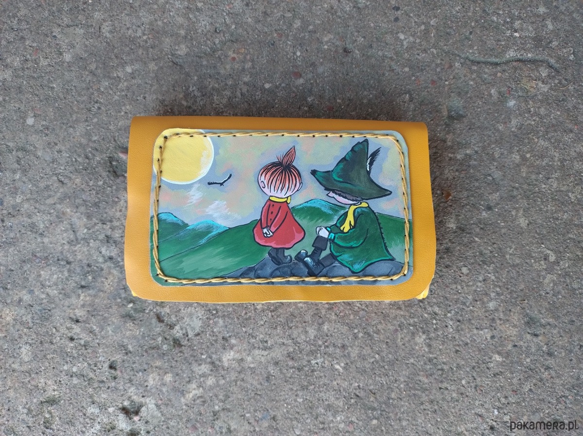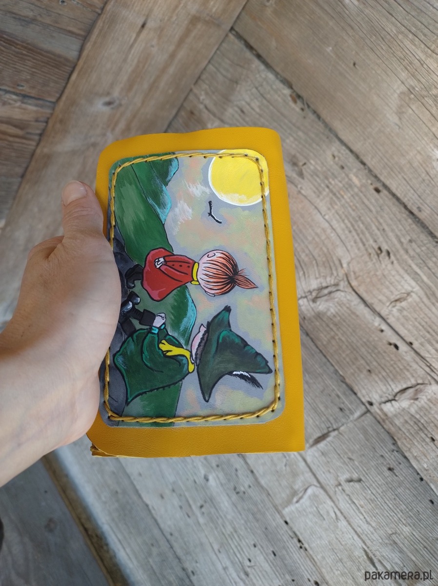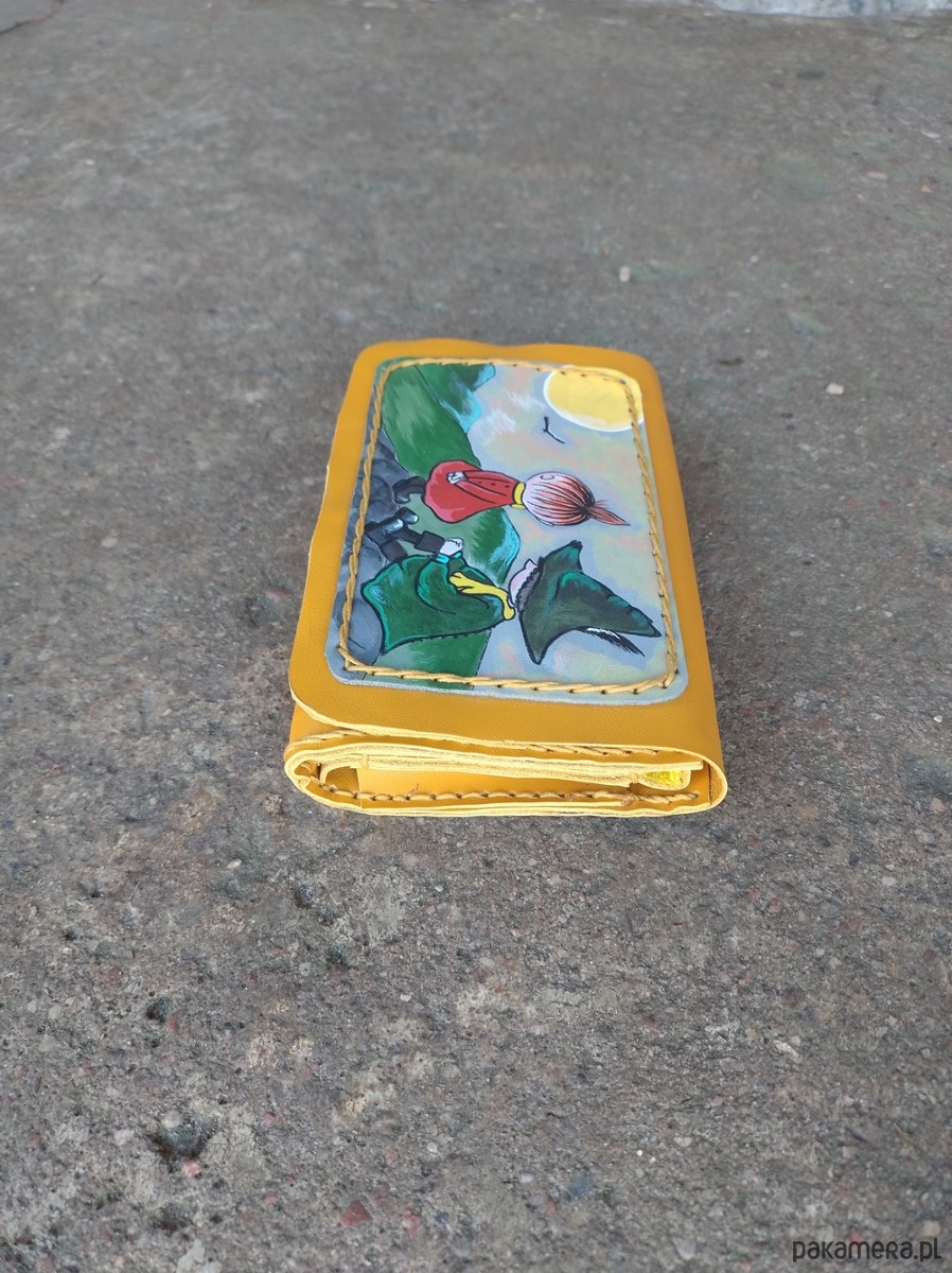 Portfel wykonany ręcznie z naturalnej , impregnowanej skóry w kolorze żółtym .Zszywany naturalnym sznurkiem . Zamykany na napę . Ozdobiony malowanym motywem przyjaciół w górach ;)))). Malowany wzór odporny na działanie czynników atmosferycznych . W środku kieszeń na monety zamykana na suwak . 2 kieszenie na banknoty oraz 4 kieszenie na karty , do każdej wchodzi kilka sztuk . Pojedynczy egzemplarz , autorski projekt . Portfel na długie lata .