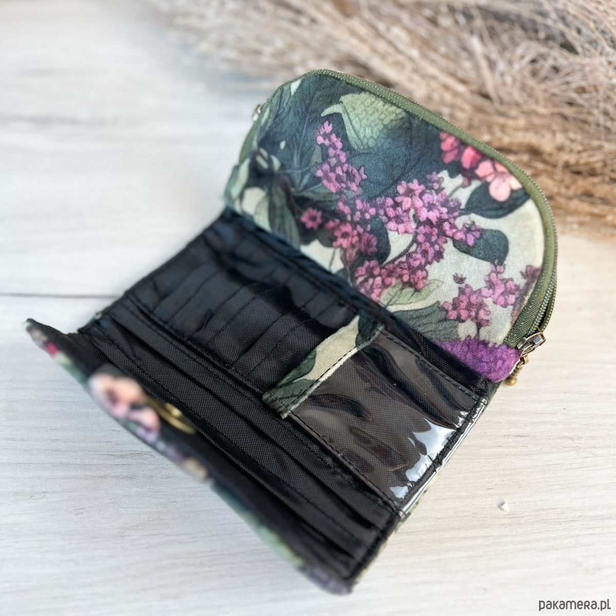 Portfel welurowy mini paradise to piękny kompaktowy portfel damski. W środku znajdziesz trzy duże przegródki, cztery mniejsze na karty oraz dużą kieszeń zapinaną na zamek do której schowasz drobne. Rozkładany portfel to świetny wybór dla osób które cenią sobie praktyczność, ale i poręczny rozmiar. W środku portfel podszyty jest czarną wodoodporną podszewką.