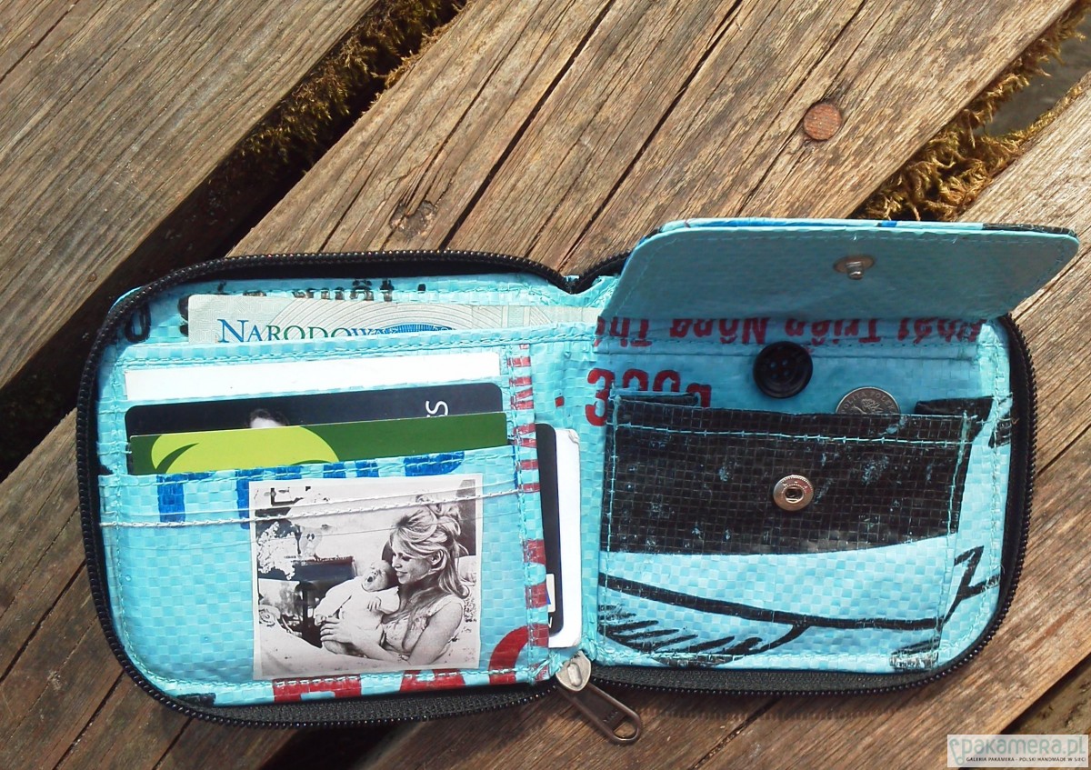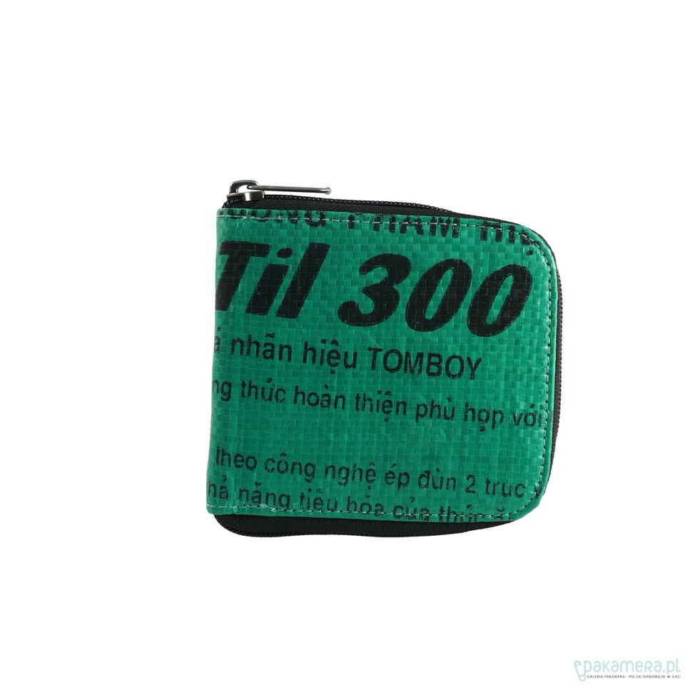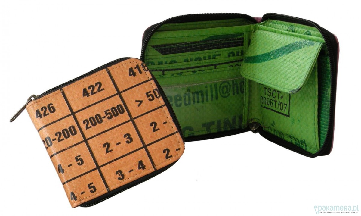 Paco- kwadratowy portfel typu unisex, zasuwany na suwak, z dużą ilością przegródek na karty, banknoty, z okienkiem na zdjęcia oraz z zapinaną na zatrzask kieszonką na bilon. Kolor- butelkowa zieleń, środek malinowy z oryginalnymi nadrukami (odcień i nadruki mogą się nieco różnić od tych zamieszczonych na zdjęciach, produkt recyclingowy, rzadko powtarzalny). Wymiary-10x10cm COLL.PART_ fair trade : to seria pomysłowych, oryginalnych i eko-odpowiedzialnych produktów wykonanych ze zużytych worków po ryżu i innych artykułów spożywczych, sprzedawanych codziennie na lokalnych targowiskach w Kambodży i Burkina Faso przez sieć organizacji społecznych zapewniających schronienie, pracę i edukację potrzebującym kobietom i dzieciom. COLL.PART. to nie tylko moda, to przede wszystkim szczytny cel i ekologia