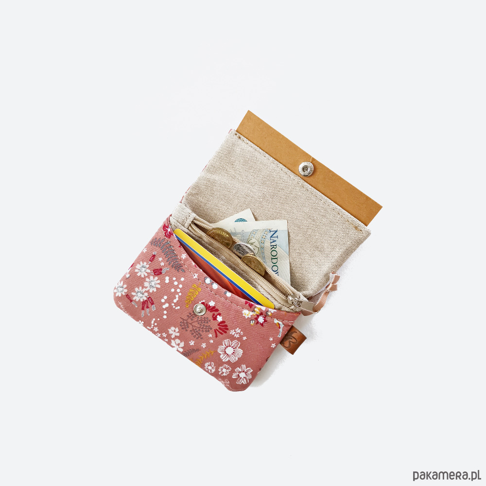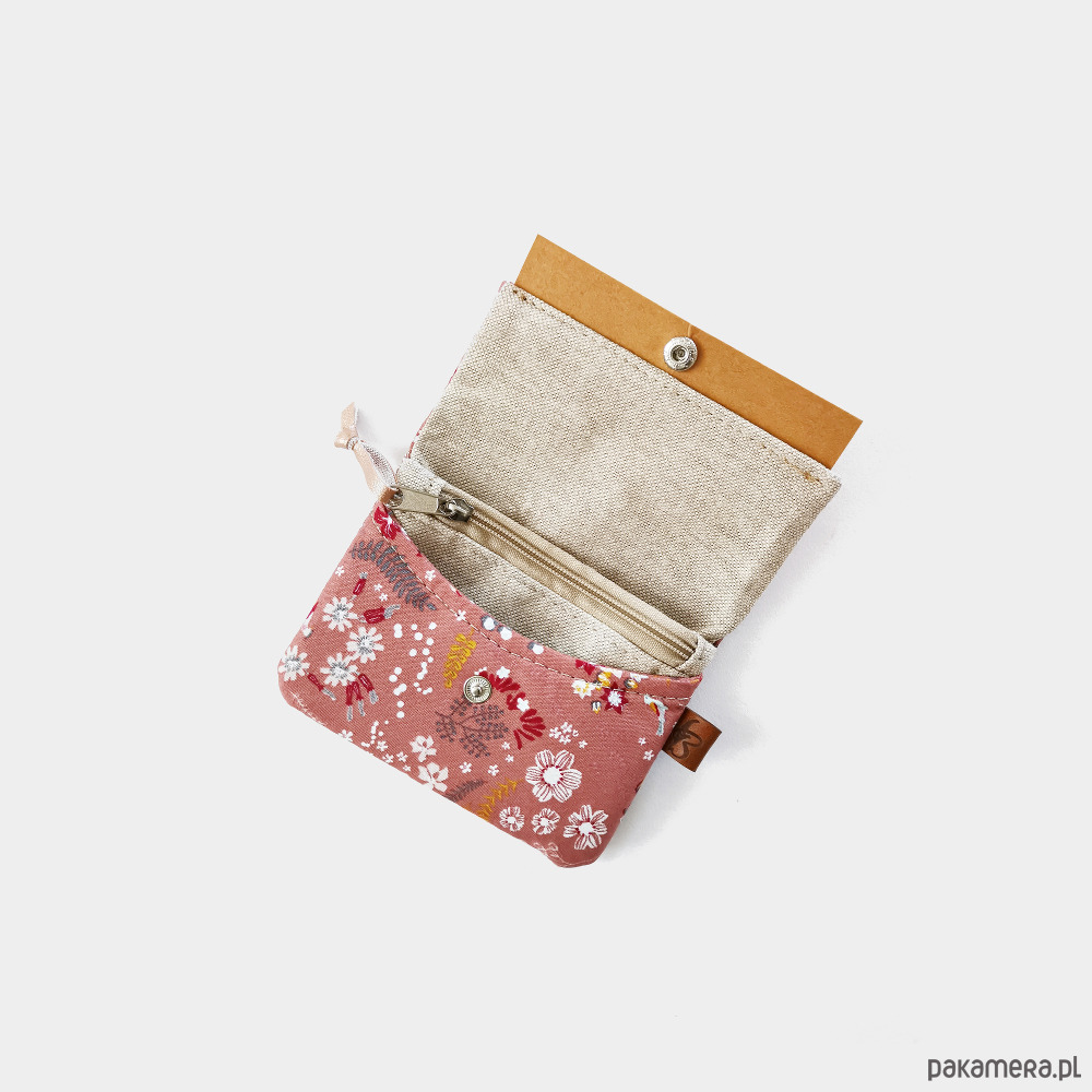 Mały poręczny portfel w wzór botaniczny na łososiowym tle.