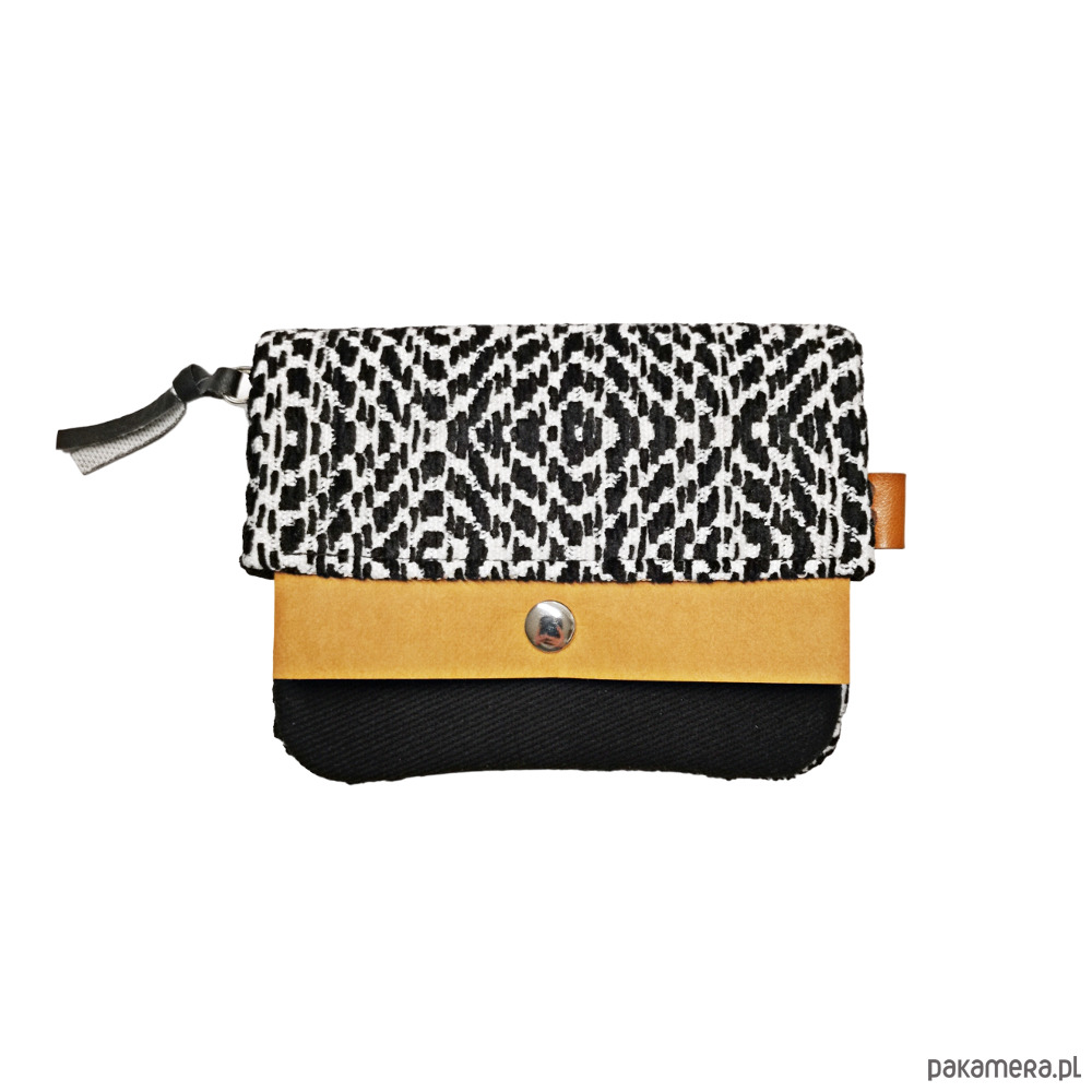 Mały poręczny portfel w wzór etniczny uszyty został przeze mnie z mocnej tkaniny o widocznym splocie.