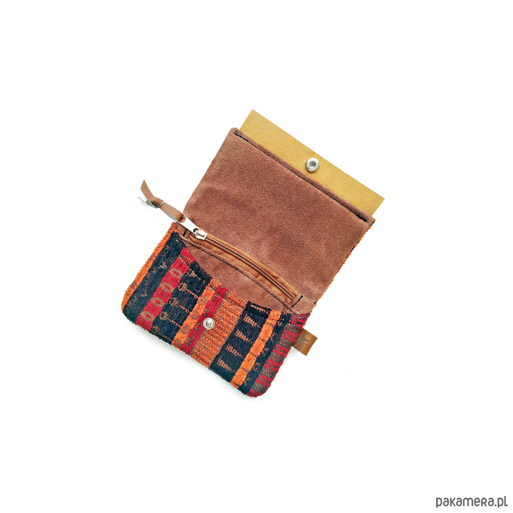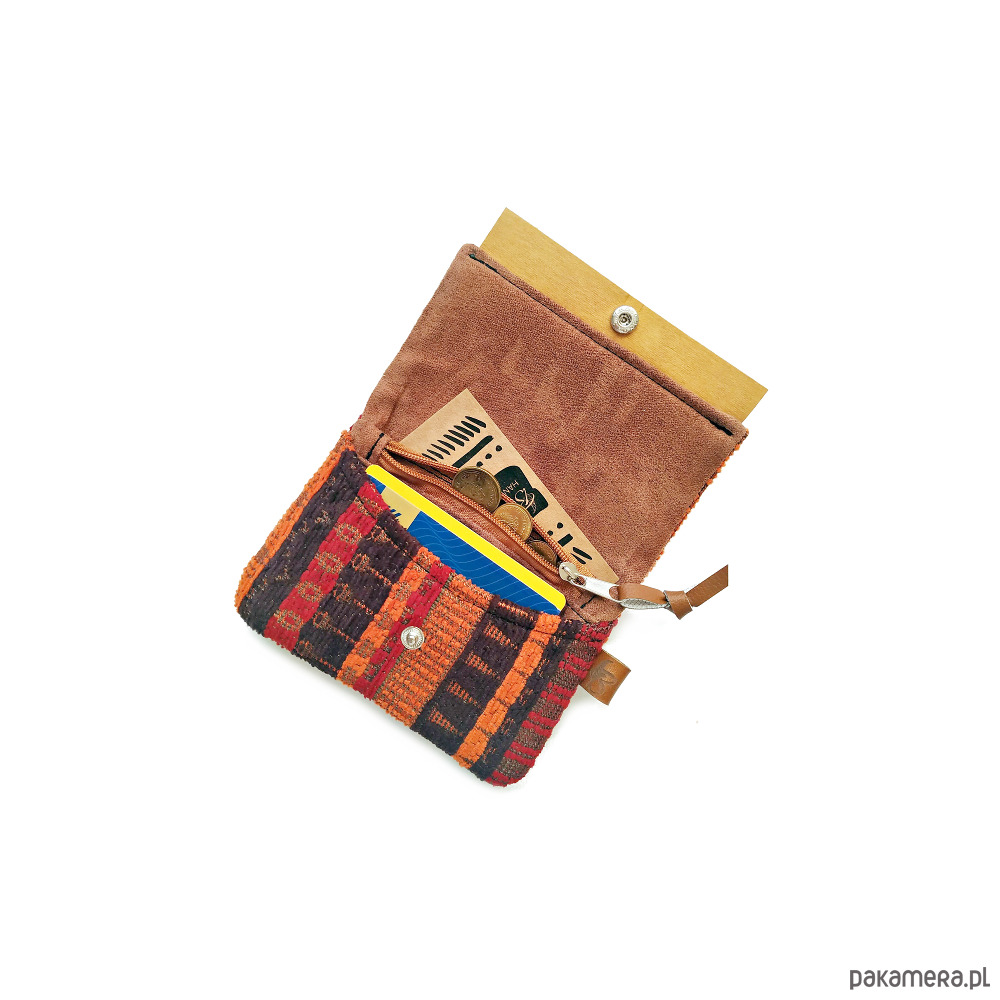 Mały poręczny portfel w wzór etniczny uszyty został przeze mnie z mocnej tkaniny o widocznym splocie.