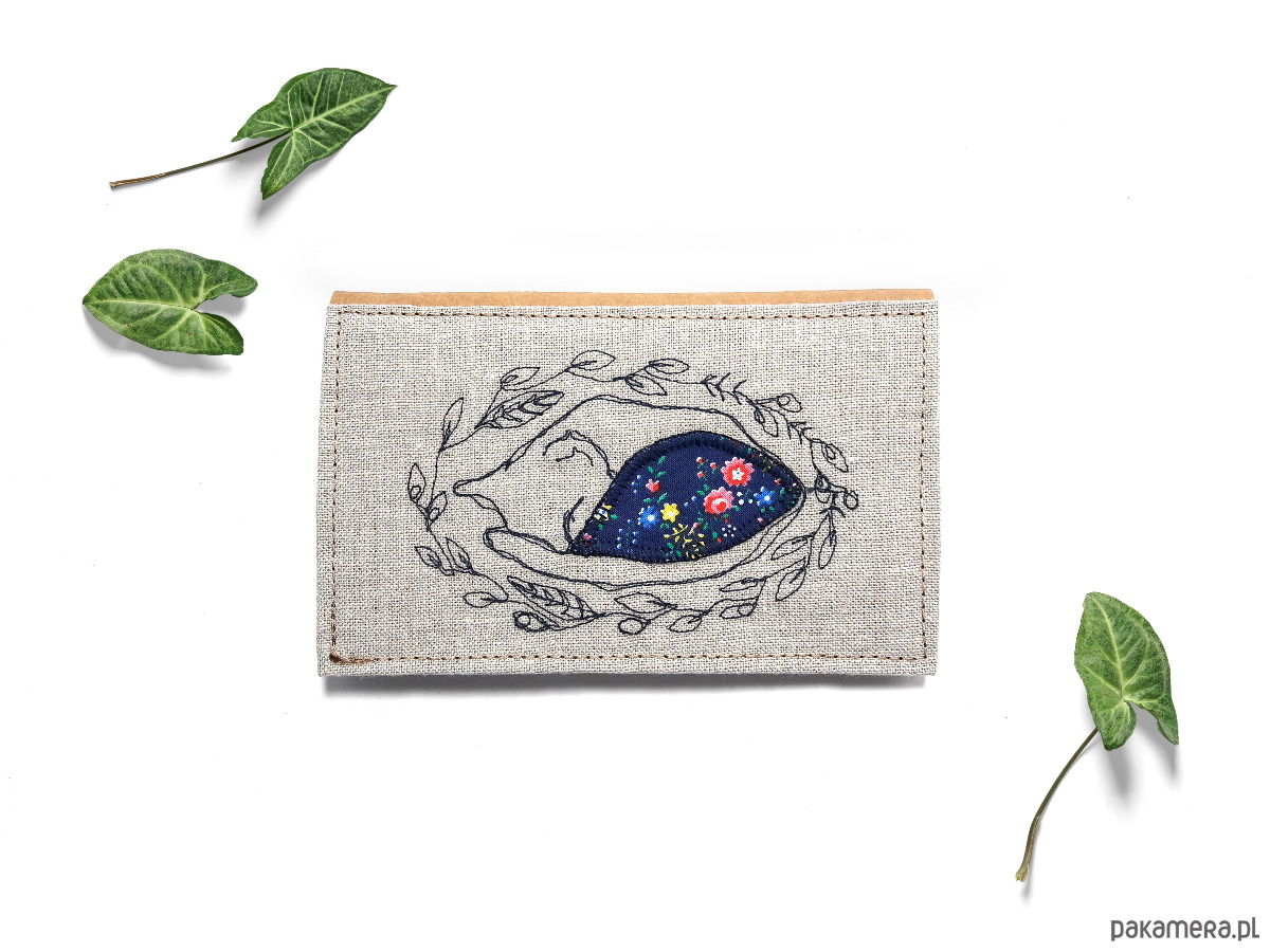 Haftowany portfel wykonany z lnu i impregnowanego papieru. Jest 100% wegański i ekologiczny.