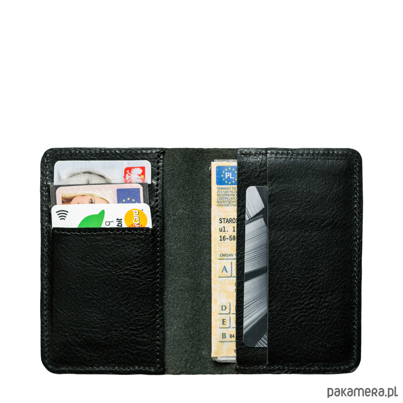 Portfel na dowód rejestracyjny uszyty z naturalnej, roślinnie garbowanej skóry w kolorze czarnym. Etui może posłużyć jako portfel posiada 3 kieszonkami na karty oraz dodatkową kieszonką na np. zwinięte banknoty. Świetna alternatywa na tradycyjny portfel za równo dla Panów jaki i dla Pań.